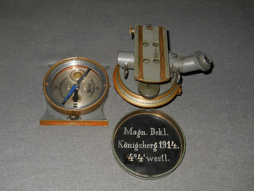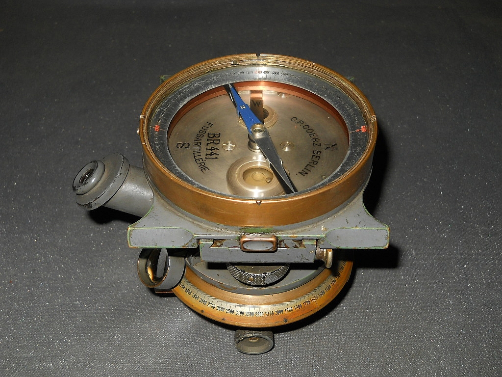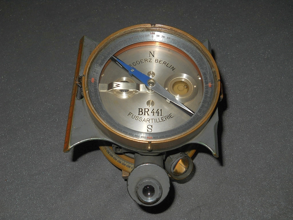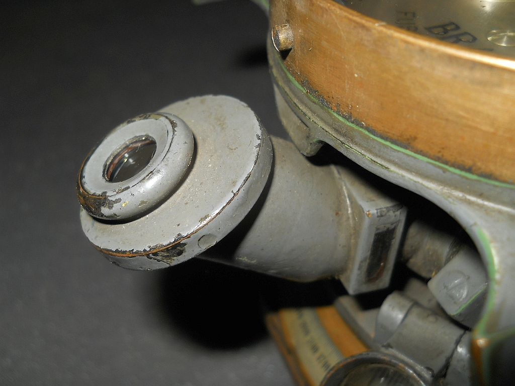 Lage abhängig. Kompassabdeckung aus Messing mit Aufschrift und Seriennummer. Die Durchsicht durch den Bussolenrichtkreis mit Strichplatte. Das Fernrohr ist in der Mitte gelagert und nach oben und