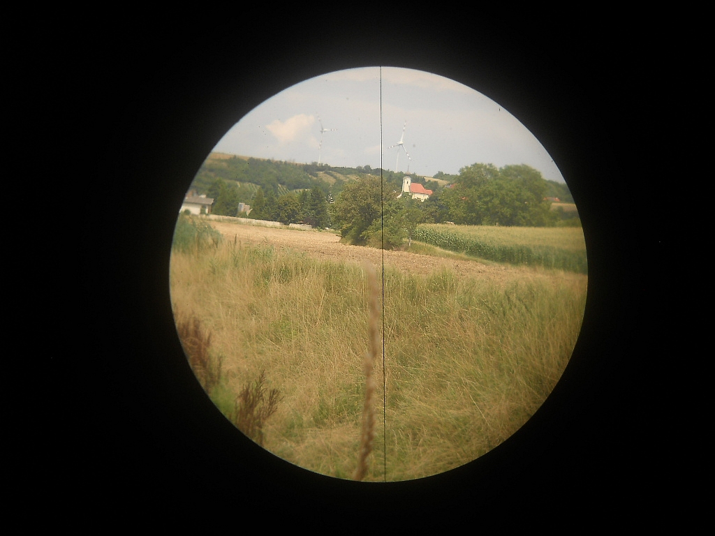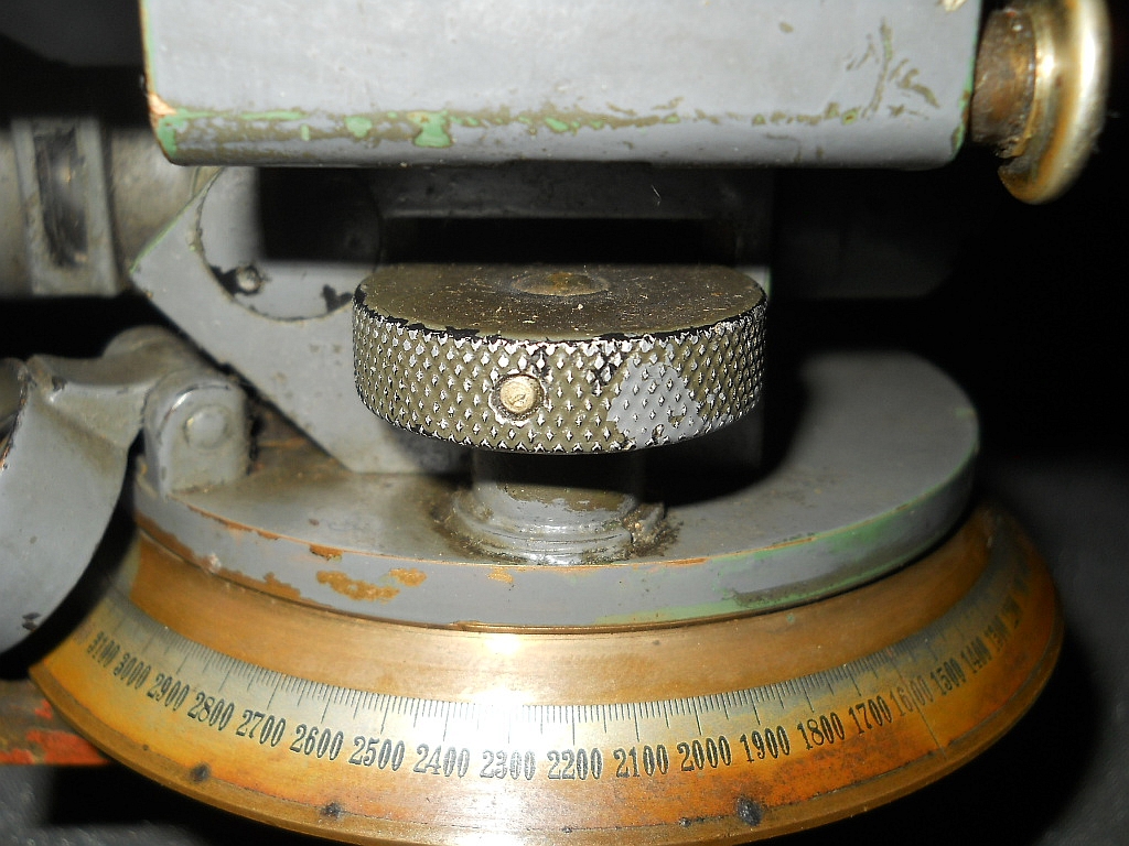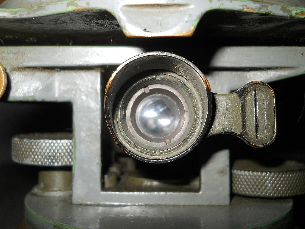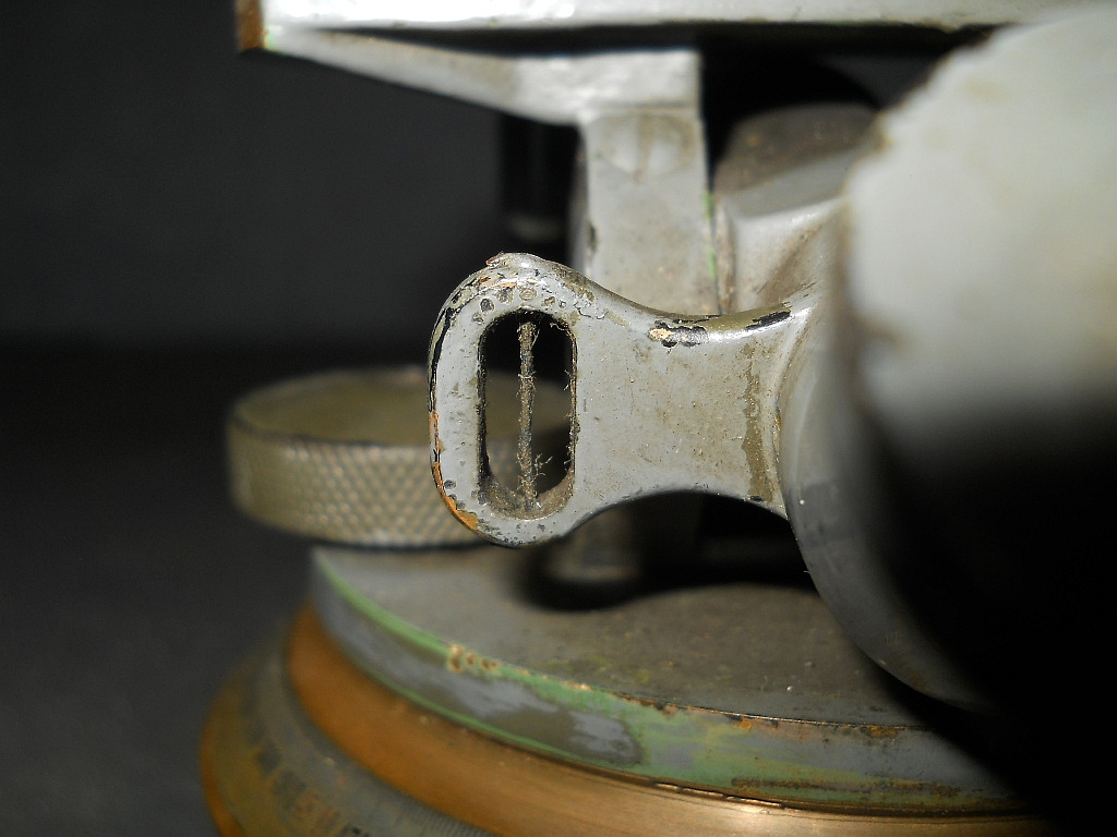 unten schwenkbar. Das Objektiv vom Bussolenrichtkreis. Die Objektivlinse misst 12 mm. Drehrad zur Gradeinstellung am Richtkreis. Einschwenkbare Lupe zur Skalenablesung. Ein Federhebel dient zur Nadelbefestigung für den Transport. Das Grobvisier mit Kimme und Korn in der Ausführung als Fadenvisier. Die Stativaufnahme mit der Befestigungsschraube hat
