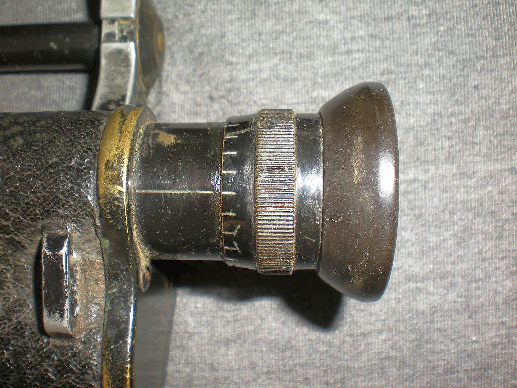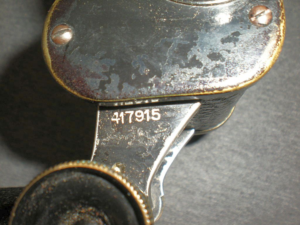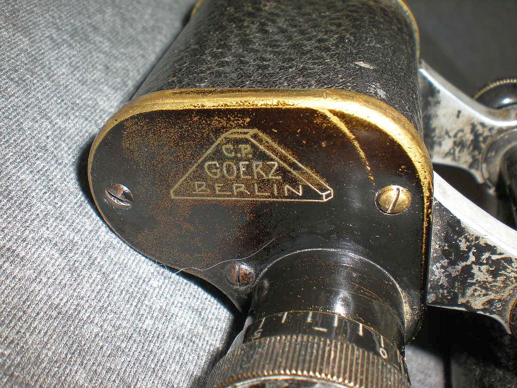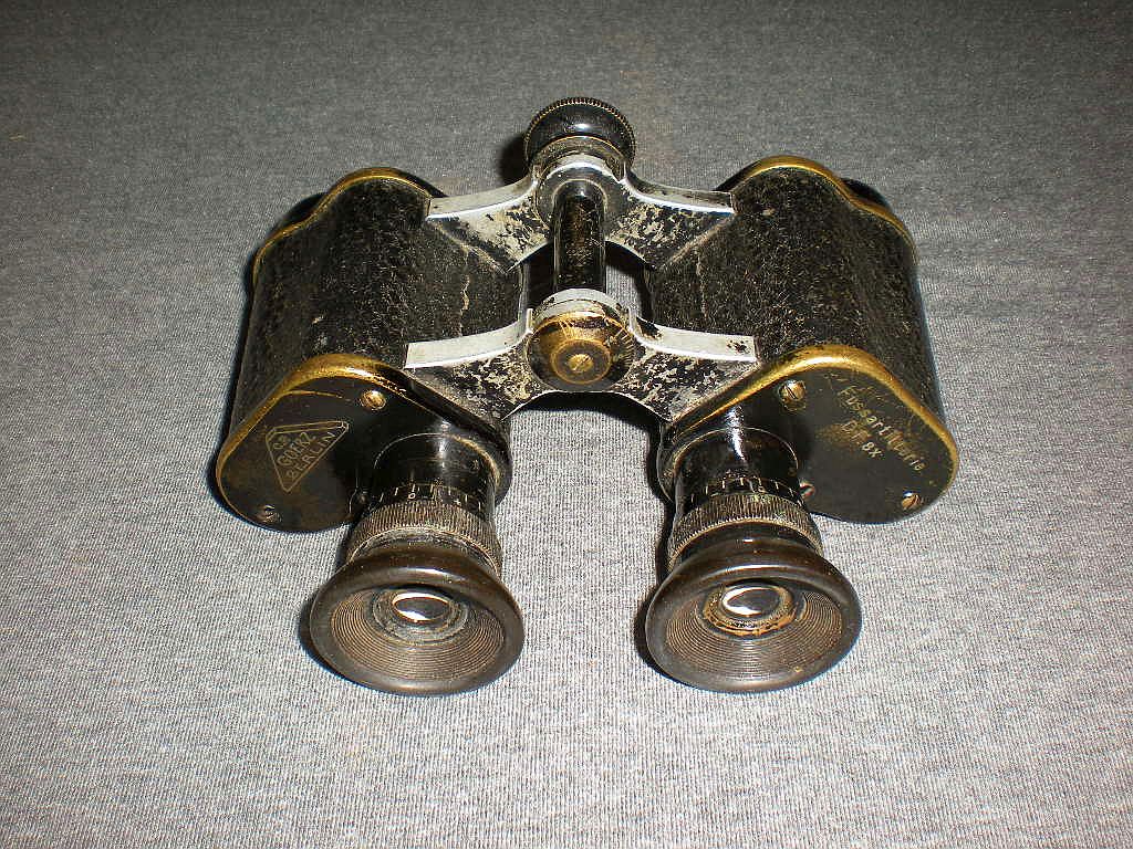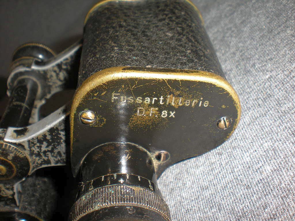 die Produktion nach Nach Auslaufen des Zeiss Patents für Ferngläser mit erweiterten Objektiv- Dieses Fernglas ist baugleich mit dem Modell Goerz D.F.99 n/A. Die neuere Dieses äußerst seltene Belegstück unterscheidet sich jedoch durch die Die Kenngröße ist 8x26. 8-fache Vergrößerung mit 26 mm Objektive. Der rechte Deckel mit der sehr seltenen Gravur "Fussartillerie" D.F. 8x. Die Seriennummer ist 417915 und die höchste bekannte Seriennummer der Die Okulare sind mit schmalen Längsrillen gefertigt. Die Klemmschraube zum Fixieren vom Augenabstand. Die Durchsicht durch das Fernglas. Breite = 16cm, Höhe = 12 cm, Gewicht = 620 g. Der original Lederköcher mit Riemen. Im Deckelinneren ist der Name W. Meyer eingraviert. Ein besonderer Dank geht an den Goerz-Spezialisten Thomas Mix für seine