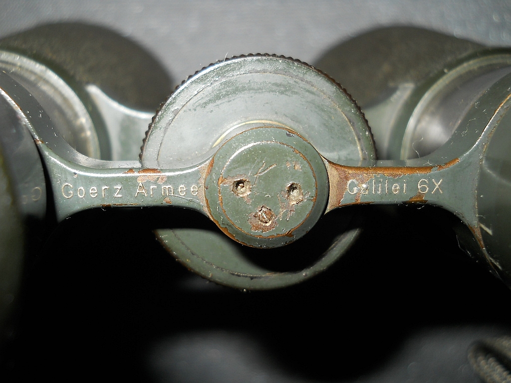 Es ist Beschriftet ist das Fernglas mit Goerz Armee, Galilei 6x, Mod. 08. Die Kenngröße ist 6x39. 6-fache Vergrößerung mit 39 mm Objetive. Es hat eine Seriennummer und eine Inventarnummer.