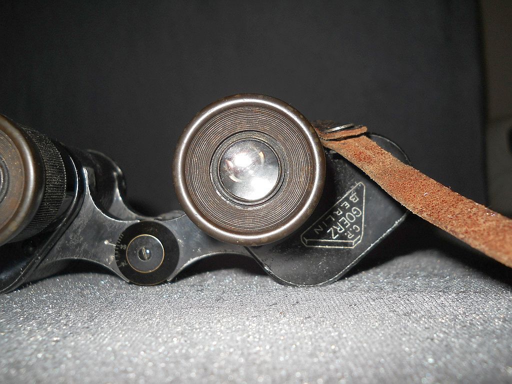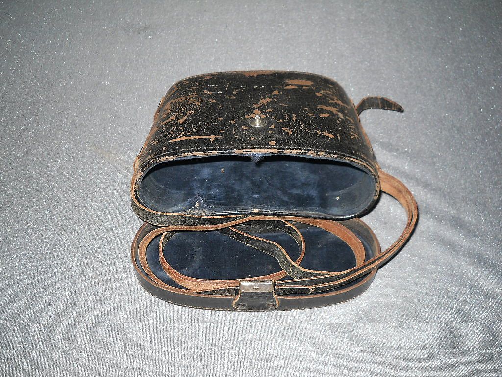Unterhalb Die Klemmschraube zum Fixieren vom Augenabstand. Die Durchsicht durch das Fernglas. Breite = 16,5 cm, Höhe = 12 cm, Gewicht = 660 g. Der original Goerz Lederköcher. Er ist innen mit blauen Samt ausgelegt.