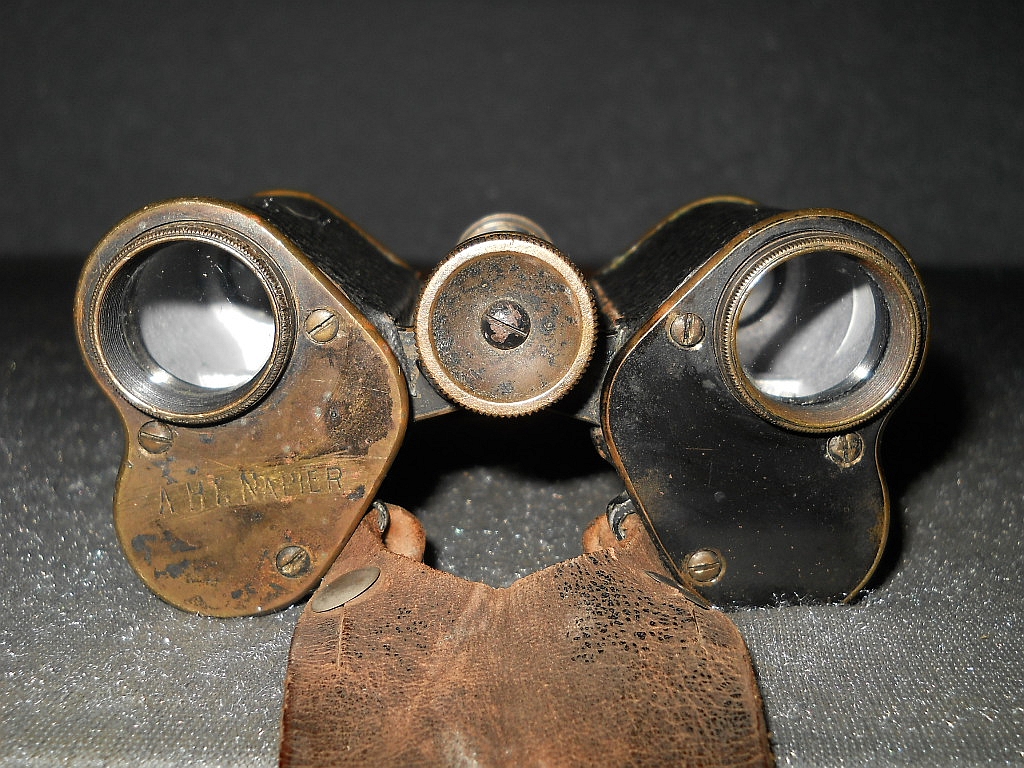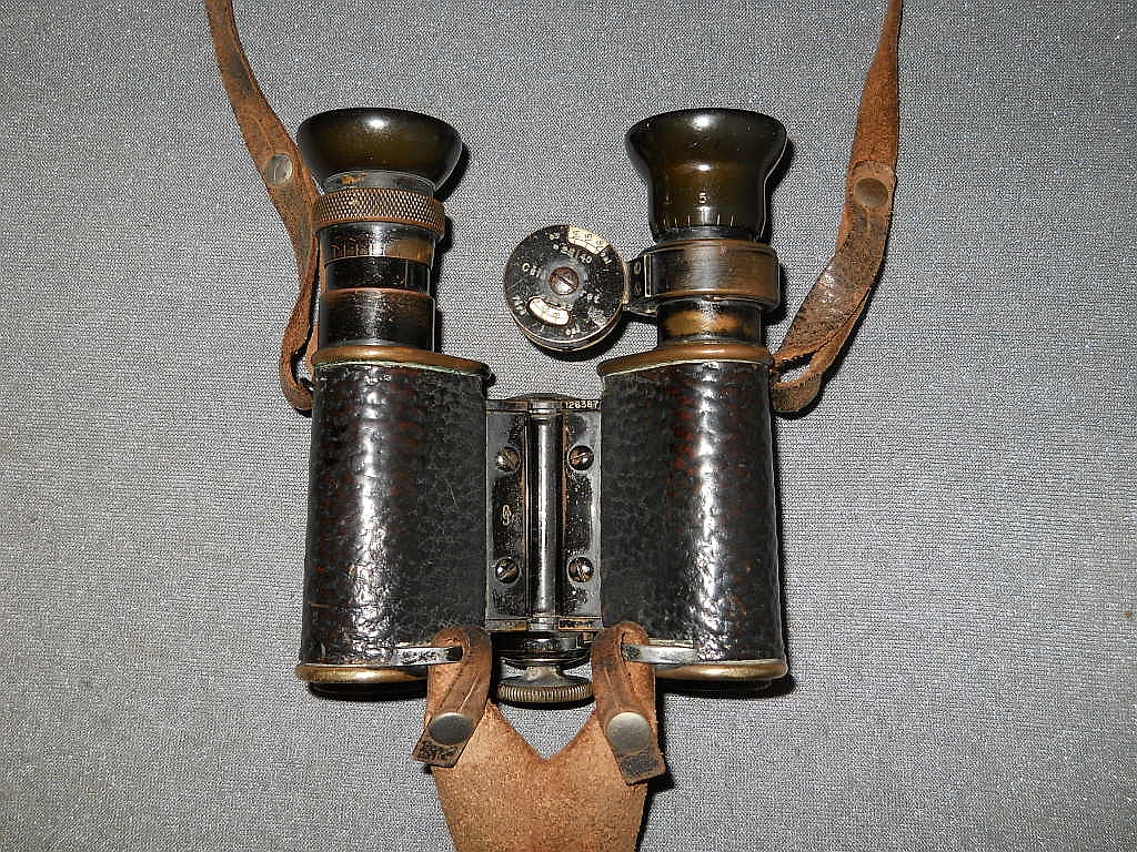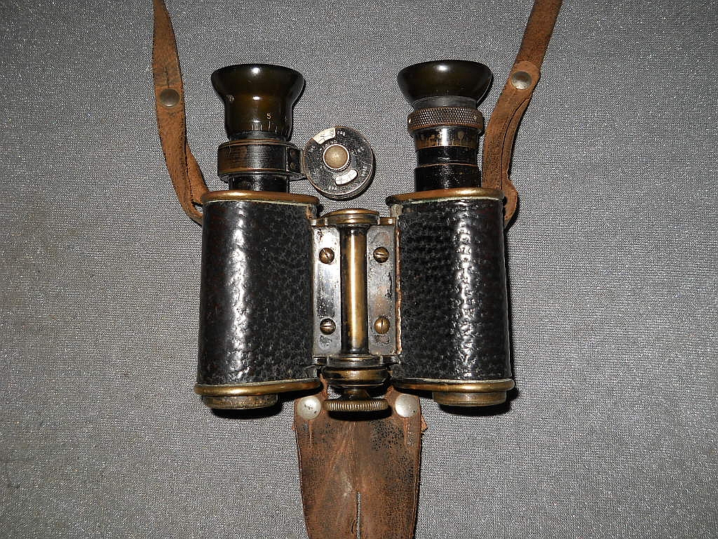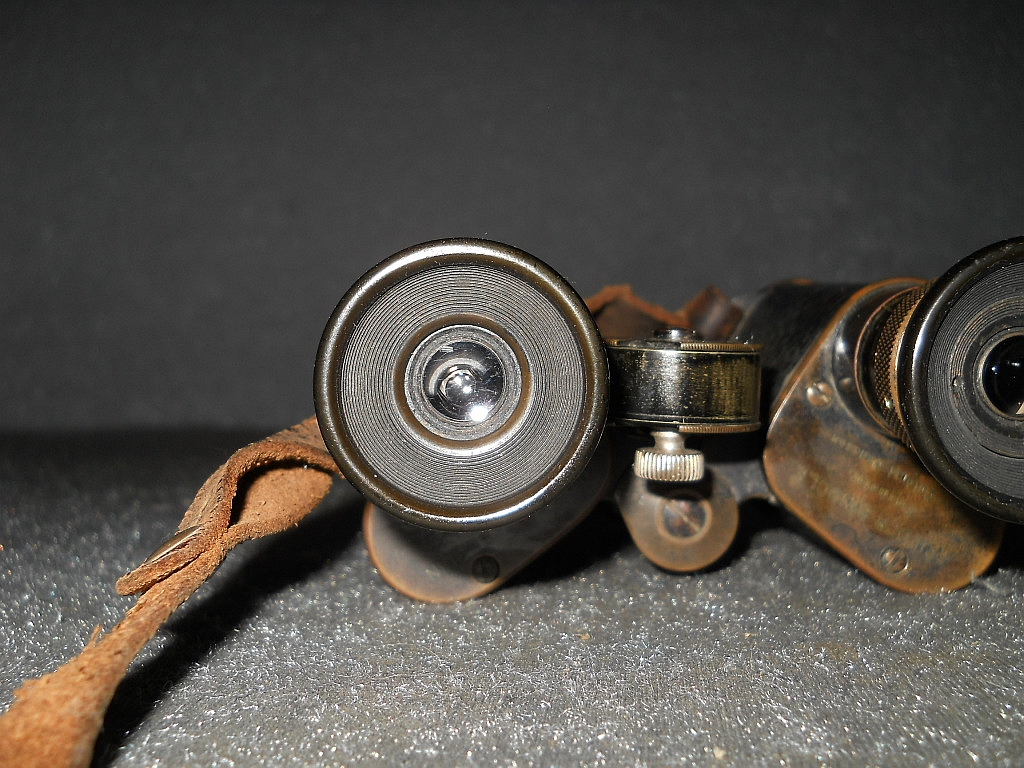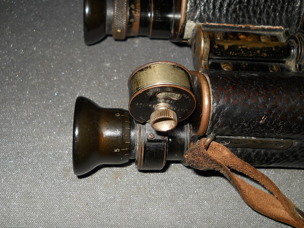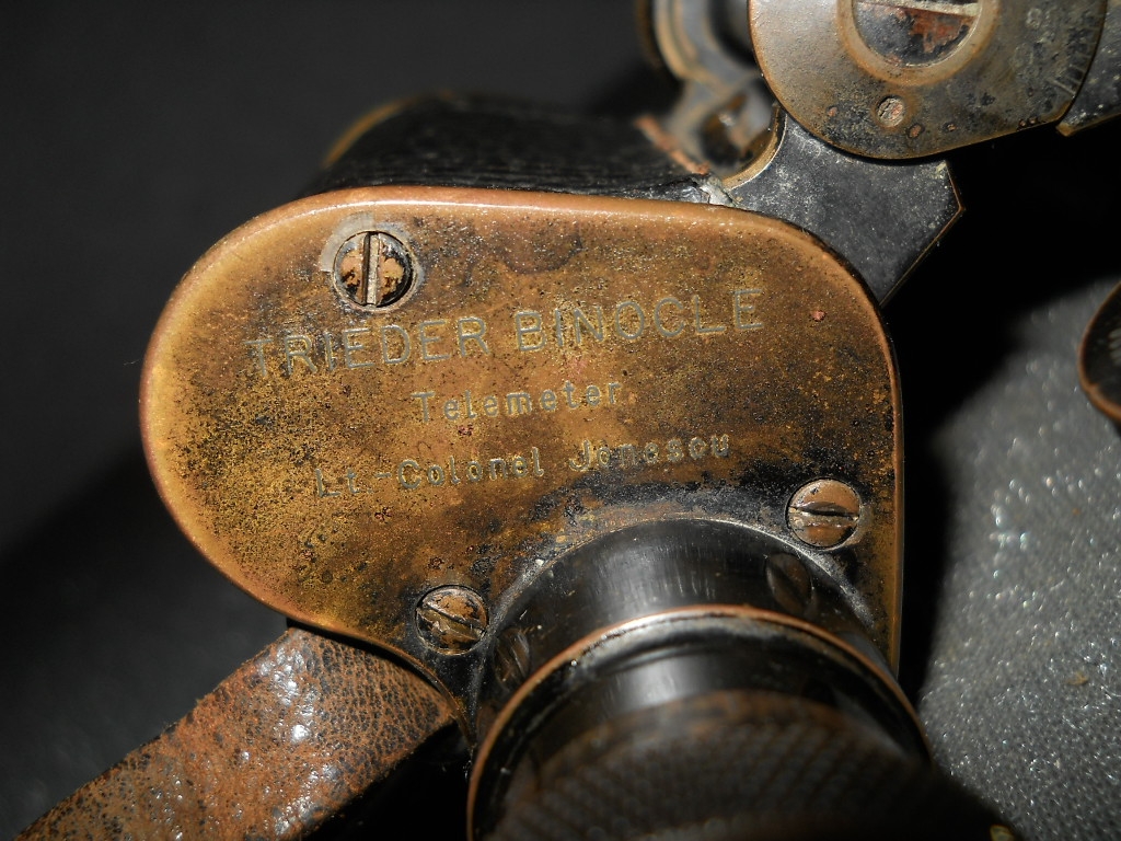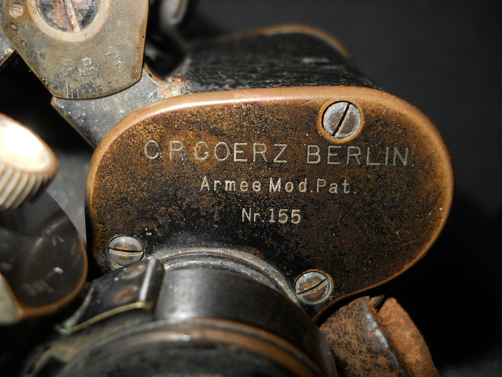 Telemetervorrichtung Durch die aufwändige Bauweise wurden vermutlich nur wenige Kleinserien Beschriftung vom rechten Deckel: C.P. Goerz Berlin - Armee Modell Patent. Beschriftung vom linken Deckel: Trieder Binocle - Telemeter, Lt. Colonel Jonescu. Die Kenngröße ist 8x20. 8-fache Vergrößerung mit 20 mm Objektive. Die Seriennummer ist 126387. Das Fernglas wurde ca. 1906 hergestellt. Die ineinander verschlungenen Buchstaben C.P.G. sind das Kurzlogo von Goerz. An der Unterseite befindet sich die Gravur A.H.G. Napier. Dieser war im WK I Im rechten Objektiv befindet sich ein Doppelfaden, bestehend