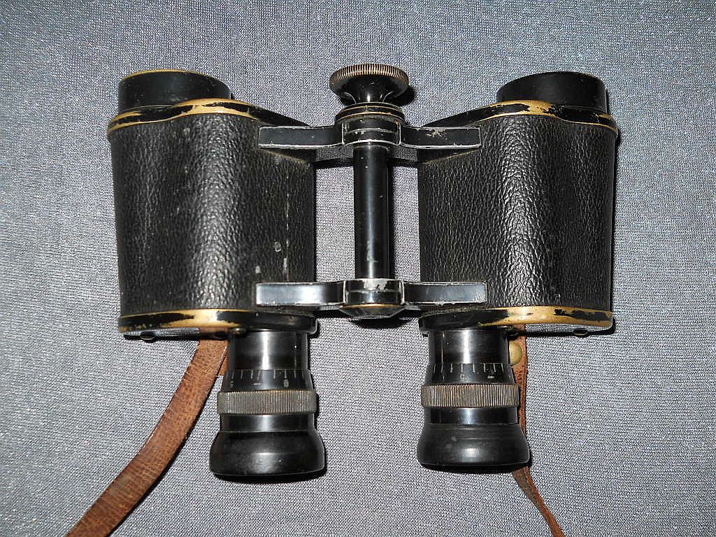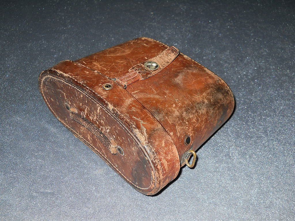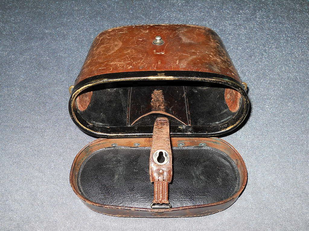 Die Der M9 Feldstecher ist das Modell von 1909. Die ÜK-Abnahme ist vom 8.10.1913. Die Klemmschraube zum Fixieren der Augenweite. Die Durchsicht mit K.u.K. Strichplatte. Das Detail der Strichplatte. Breite = 16 cm, Höhe = 12 cm, Gewicht = 720 g. Der original militärische Lederköcher. Der Deckelrand ist mit einem Messingring verstärkt.