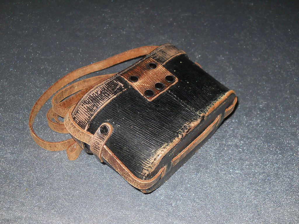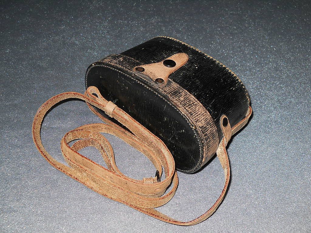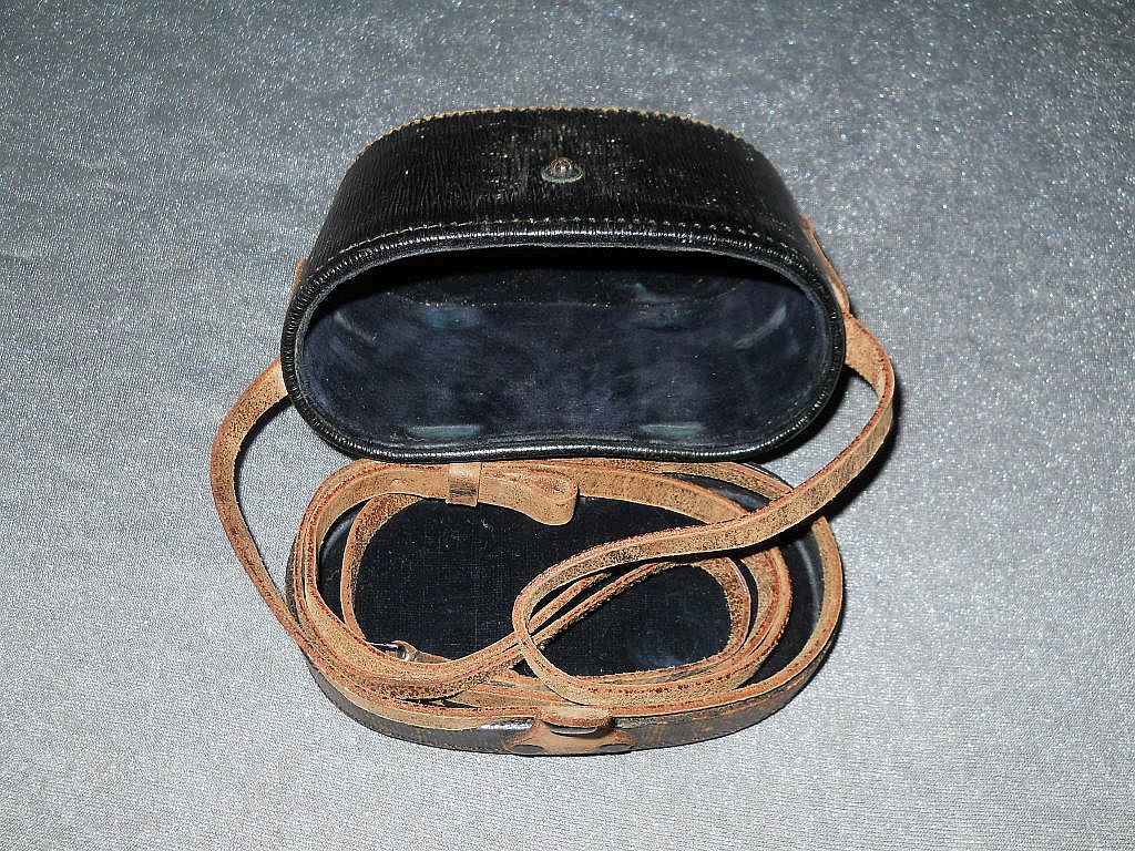 Einstellung der Der Diotrienausgleich befindet sich am rechten Okular. Die Durchsicht durch das Fernglas. Breite = 11,5 cm, Höhe = 7 cm, Gewicht = 420 g. Der original Lederköcher. Er ist innen mit blauen Samt ausgelegt.