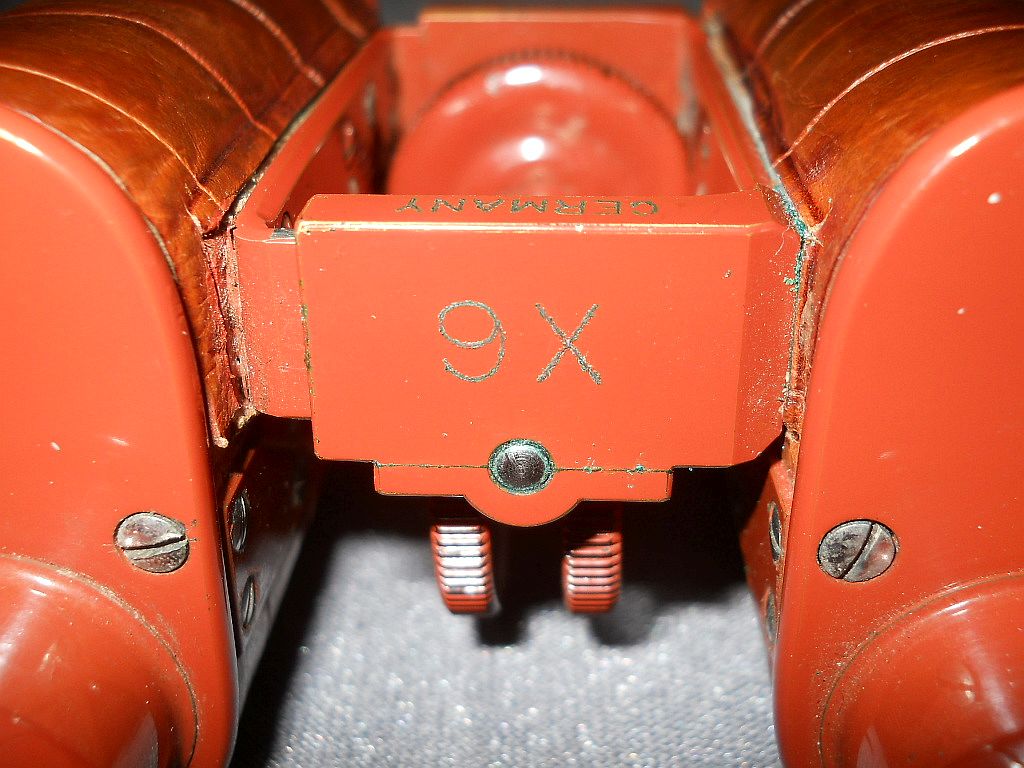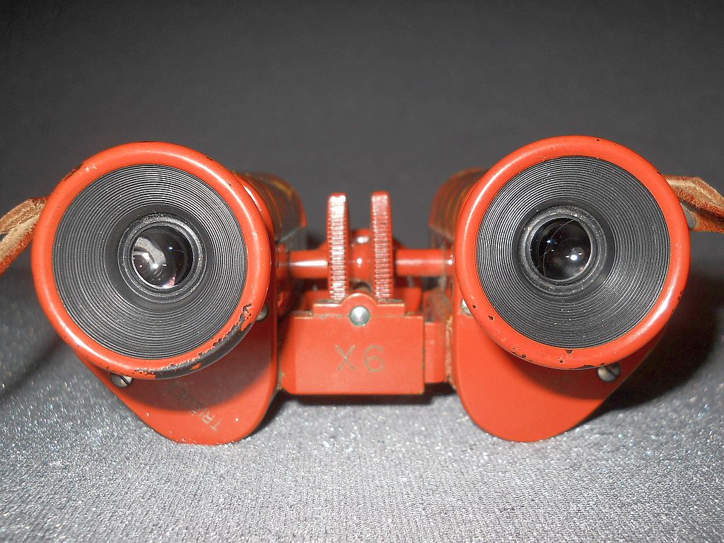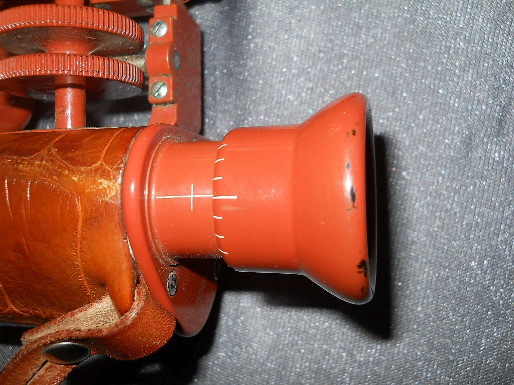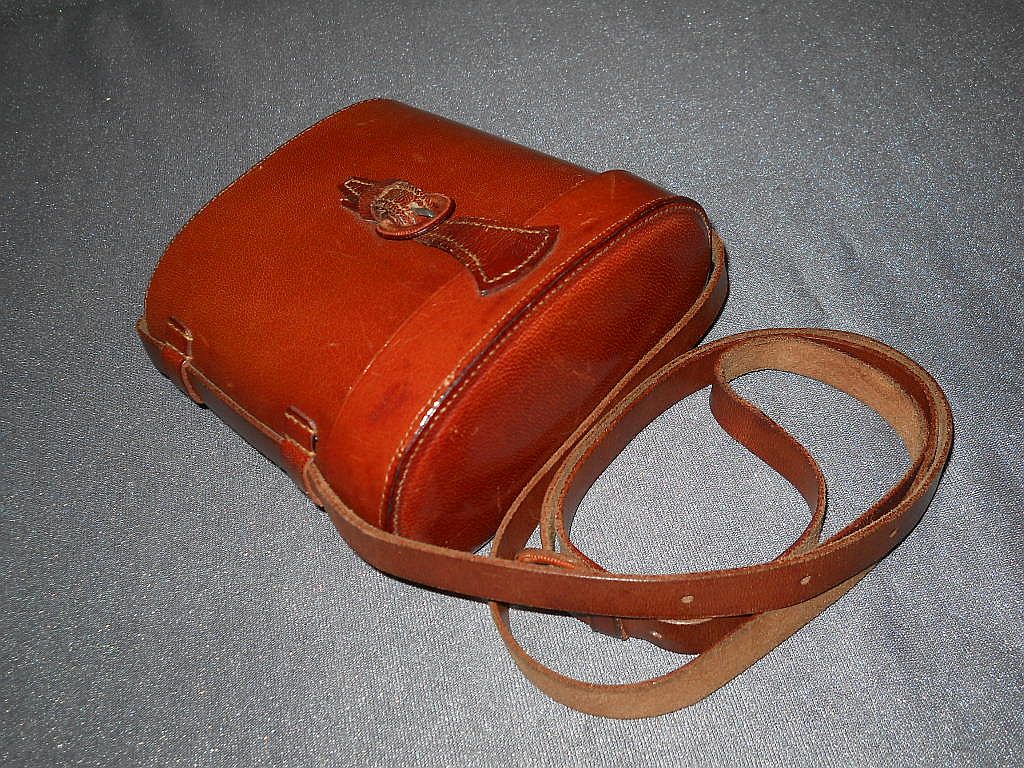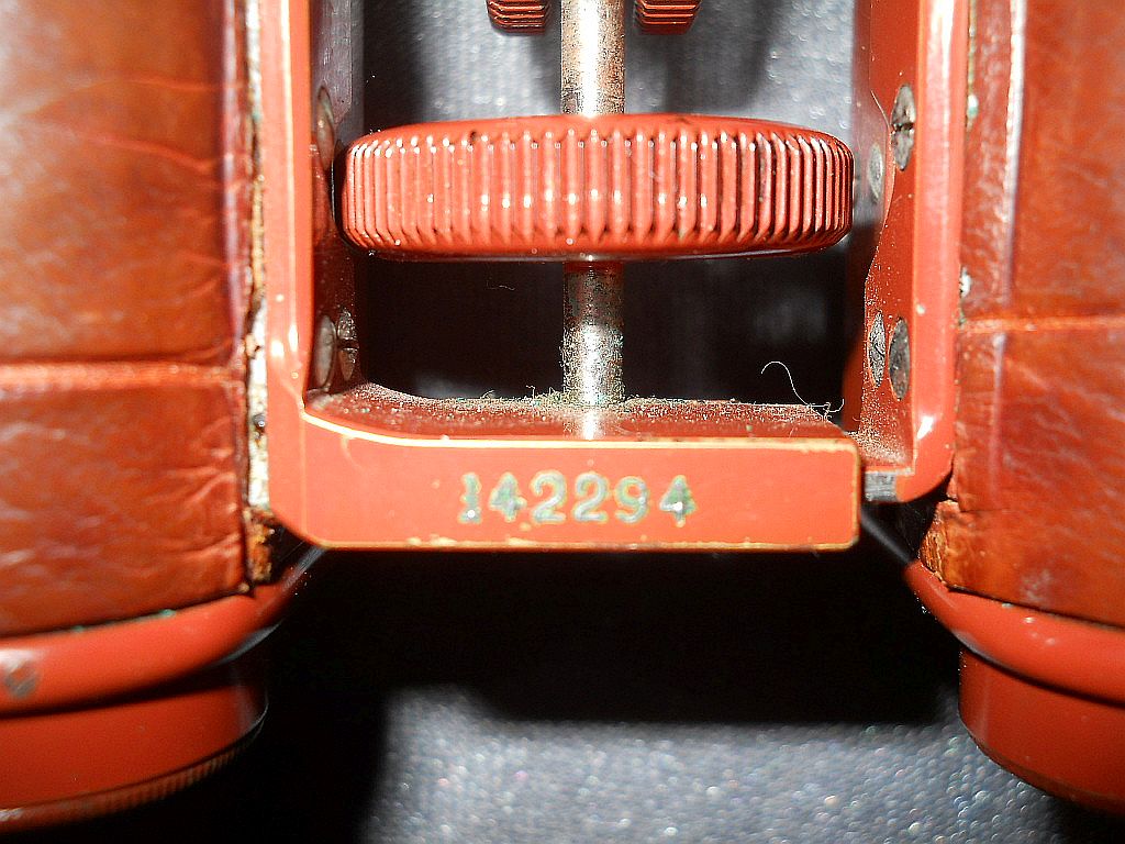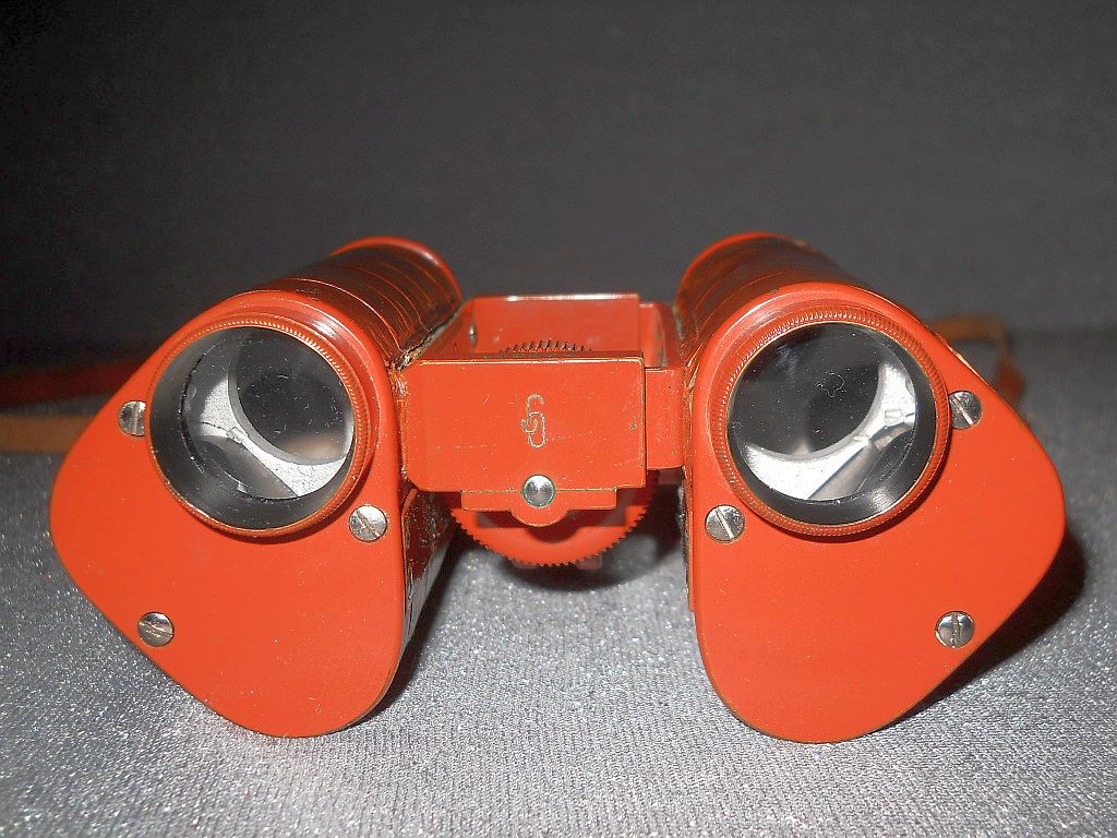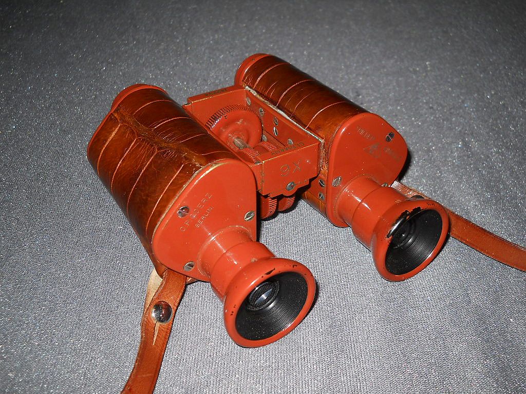 Zahnradmechanismus. Der Dioptrienausgleich befindet sich am rechten Okular. Die Durchsicht durch das Fernglas. Breite = 11,5 cm, Höhe = 11,5 cm, Gewicht = 520 g. Der original Lederköcher. Er ist innen mit weinroten Samt ausgelegt.