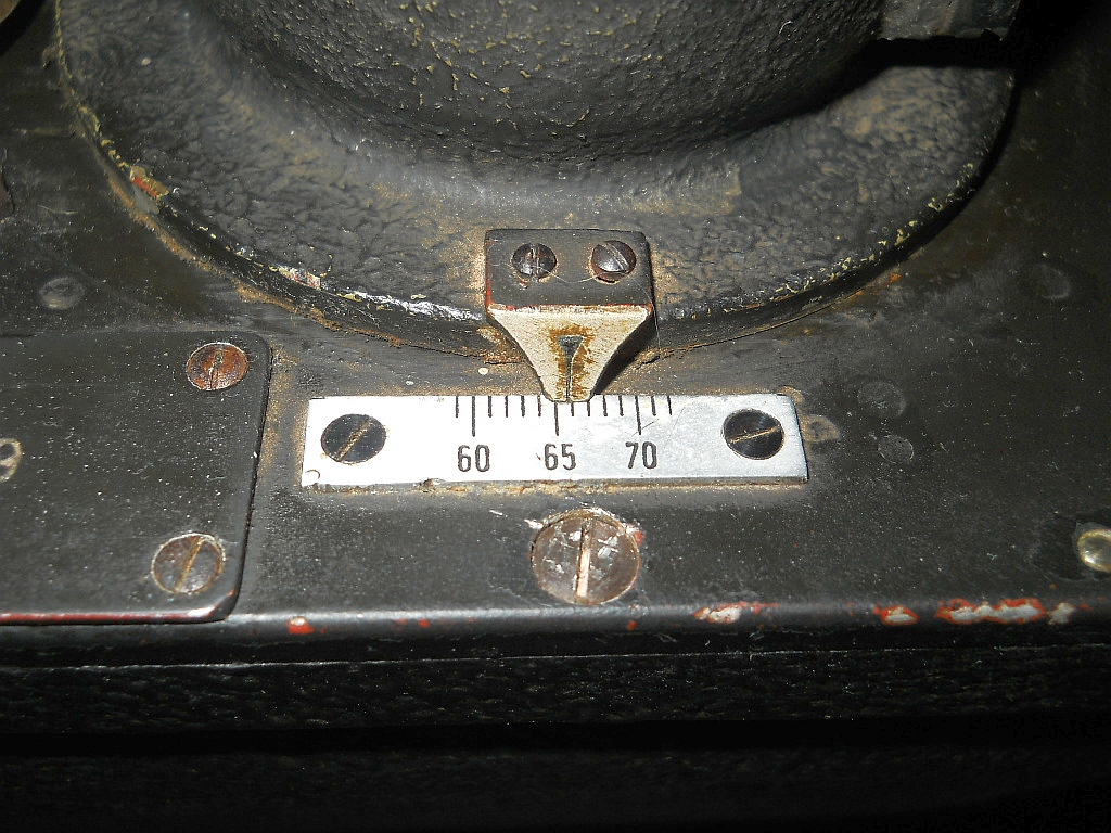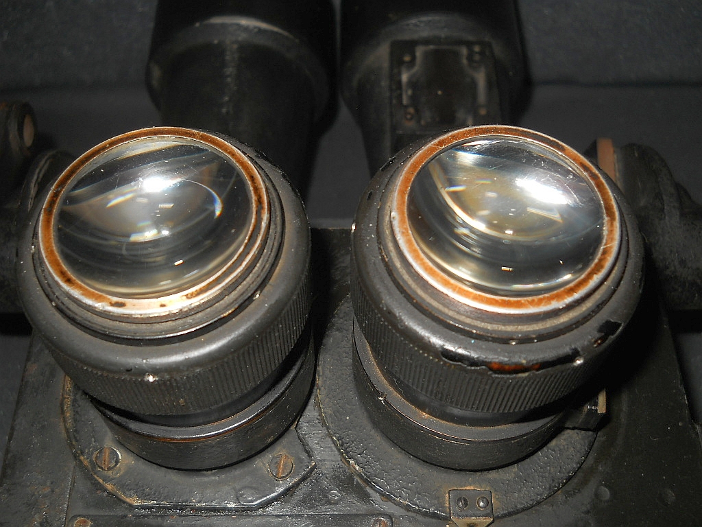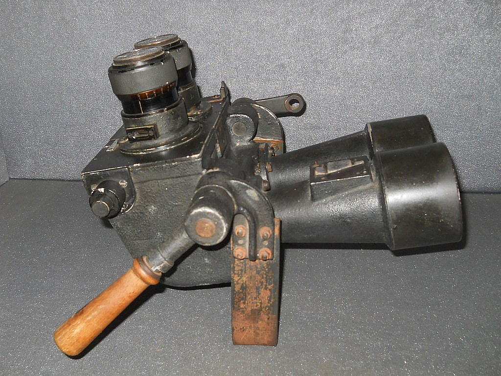 Okularlinsen messen Das Rad zur Einstellung des Augenabstandes. Die Skala vom Augenabstand. Das Fenster für die Strichplattenbeleuchtung. Das aufgeschraubte Grobvisier mit Kimme und Korn. Die Unterseite vom Flakglas mit Wiege. Die Durchsicht rechte Seite mit Strichplatte. Die Durchsicht linke Seite. Breite mit Wiege = 30 cm, Korpusbreite = 18 cm, Länge = 30 cm, Gewicht = 6850 g. Die Optik ist nicht vergütet. Dieses Modell wurde baugleich auch von der ungarischen Firma MOM hergestellt.