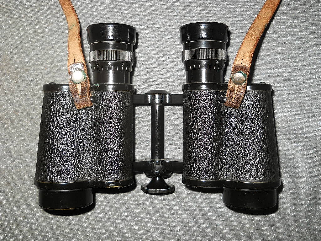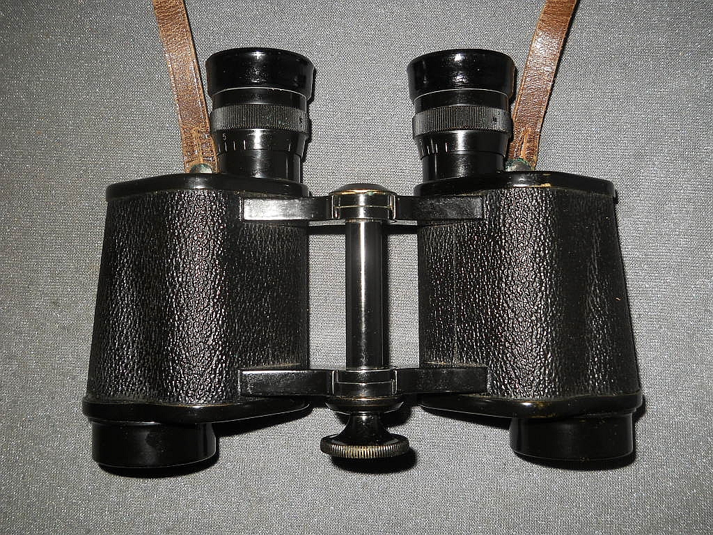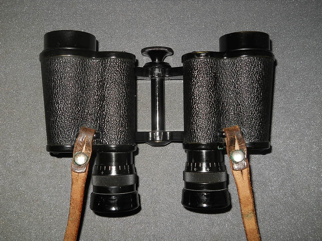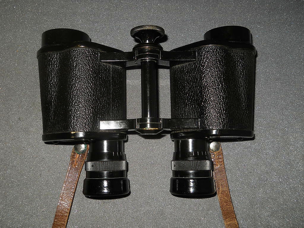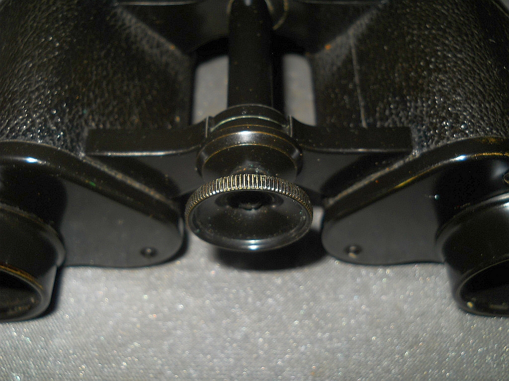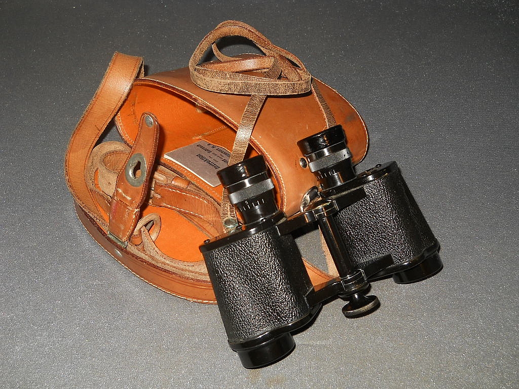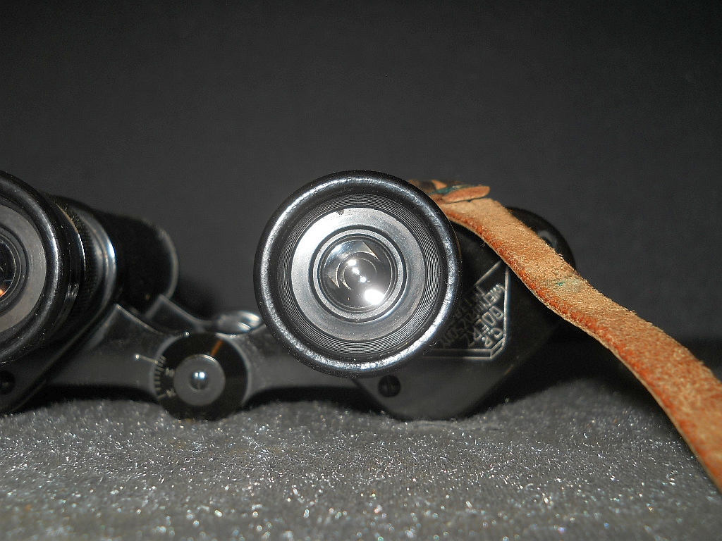 befindet sich Die Klemmschraube zur Fixierung des eingestellten Augenabstandes. Die Durchsicht durch das Fernglas. Breite = 16 cm, Höhe = 12 cm, Gewicht = 710 g. Der original Lederköcher. Mit der im Innenfach befindlichen Instruktionsanleitung.