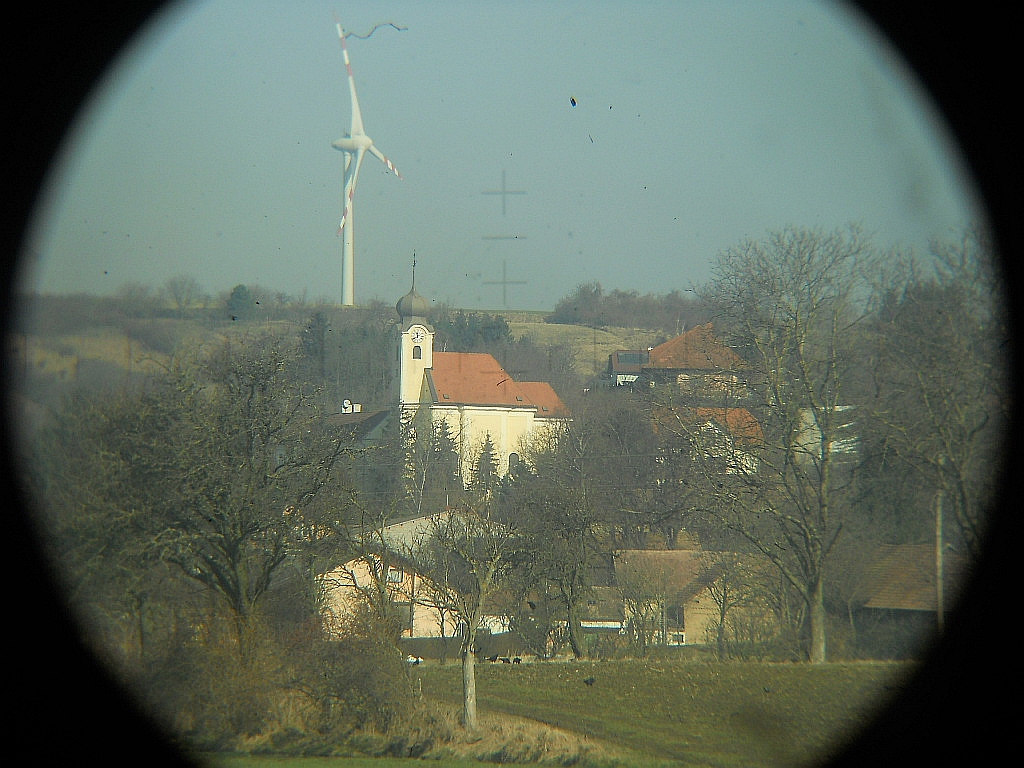 Eine Bohrung am Die Durchsicht links, mit der linksseitig verbauten Strichplatte. Die Durchsicht rechte Seite. Breite = 20,5 cm, Höhe = 20 cm, Gewicht = 1400 g. Die Optik ist vergütet.