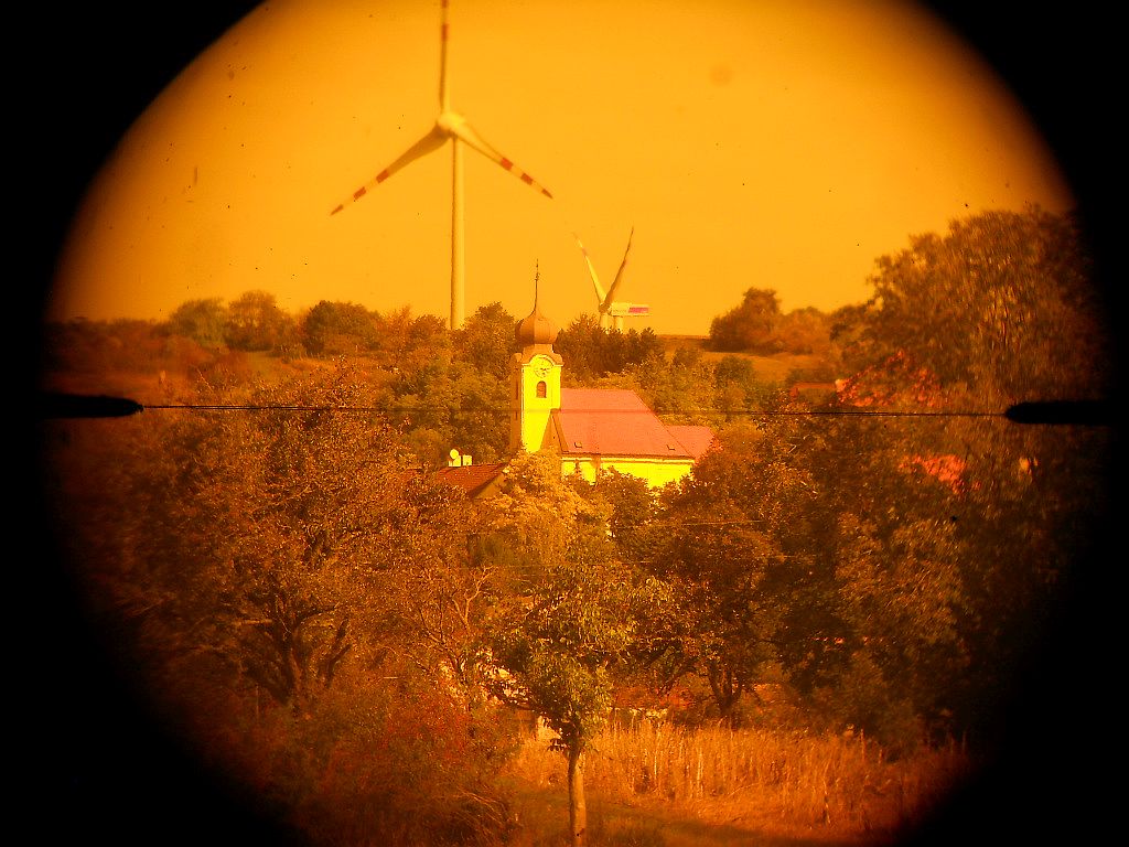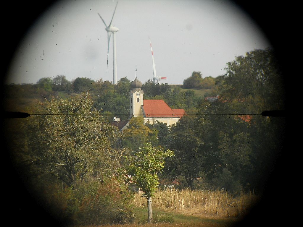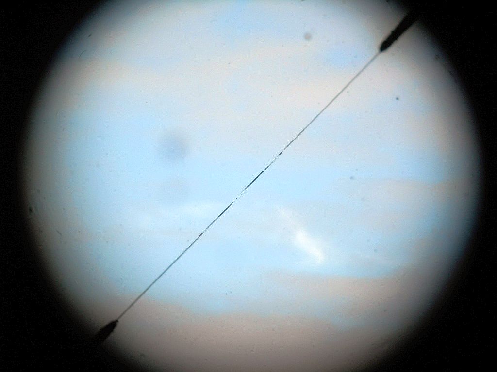 aufgesetzt Der untere Rändelring am rechten Okular ist zum Verstellen der Strichplattte. Die Klemmschraube zum Fixieren vom Augenabstand. Die rechte Durchsicht mit Strichplatte in horizontaler Stellung. Die Strichplatte besteht aus einem an den Rändern verstärkten Metallfaden. Die linke Durchsicht. Die Durchsicht mit der Filterstellung "gelb". Die Durchsicht mit der Filterstellung "grau". Breite = 16 cm, Höhe= 18 cm, Gewicht = 1500 g!