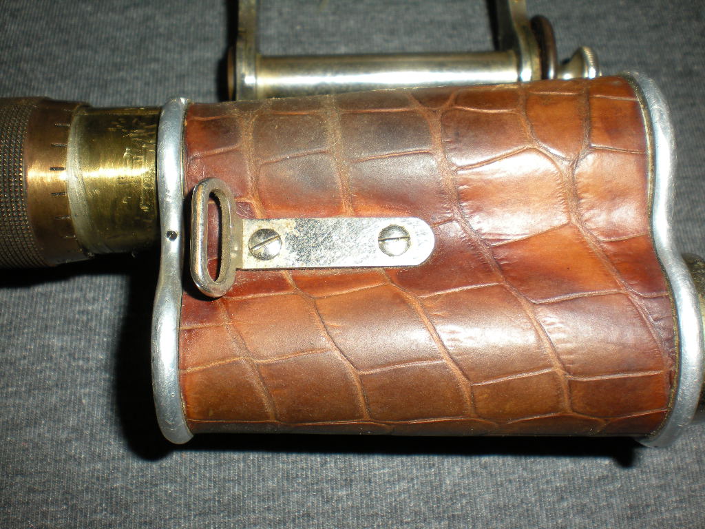 ver- Die Riemenösen sind Messing vernickelt. Die Makiervorrichtung als Indiz ziviler Ferngläser. Breite = 14 cm, Höhe = 11 cm, Gewicht = 430 g.