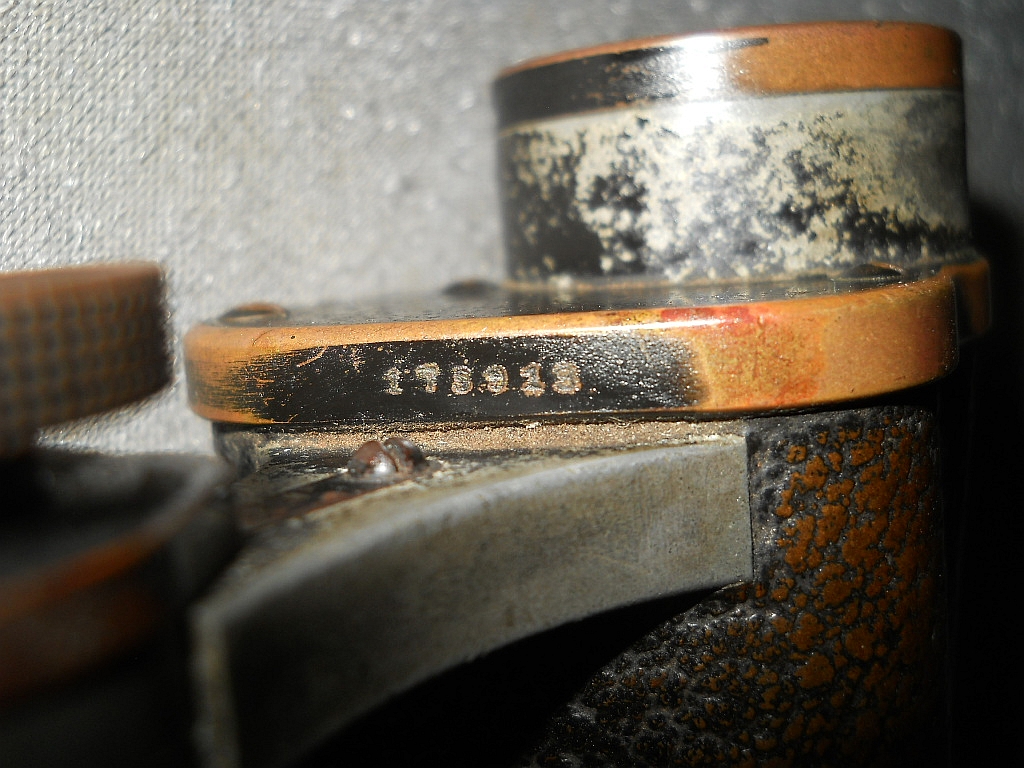 Seriennummer. Das 3/3 Okular mit Kreuzrändelung. Die Ausführung mit kurzen Zweiringstutzen. Die große Klemmschraube als militärisches Indiz. Die Durchsicht durch das Fernglas. Breite = 14 cm, Höhe = 11 cm, Gewicht = 400 g.