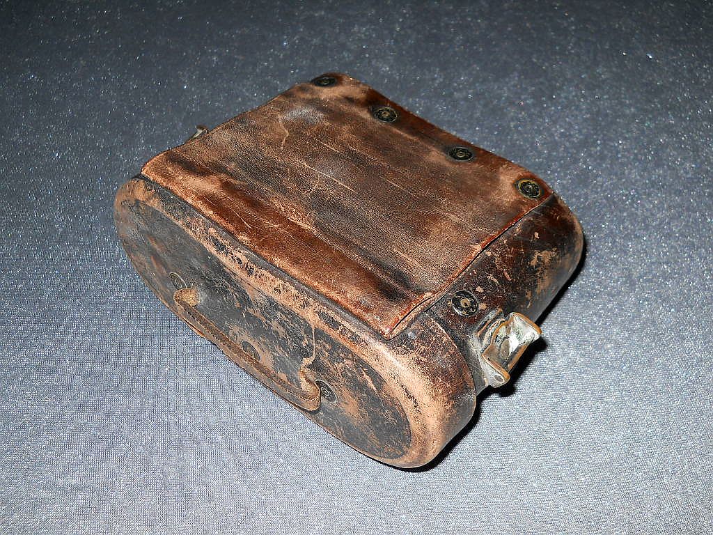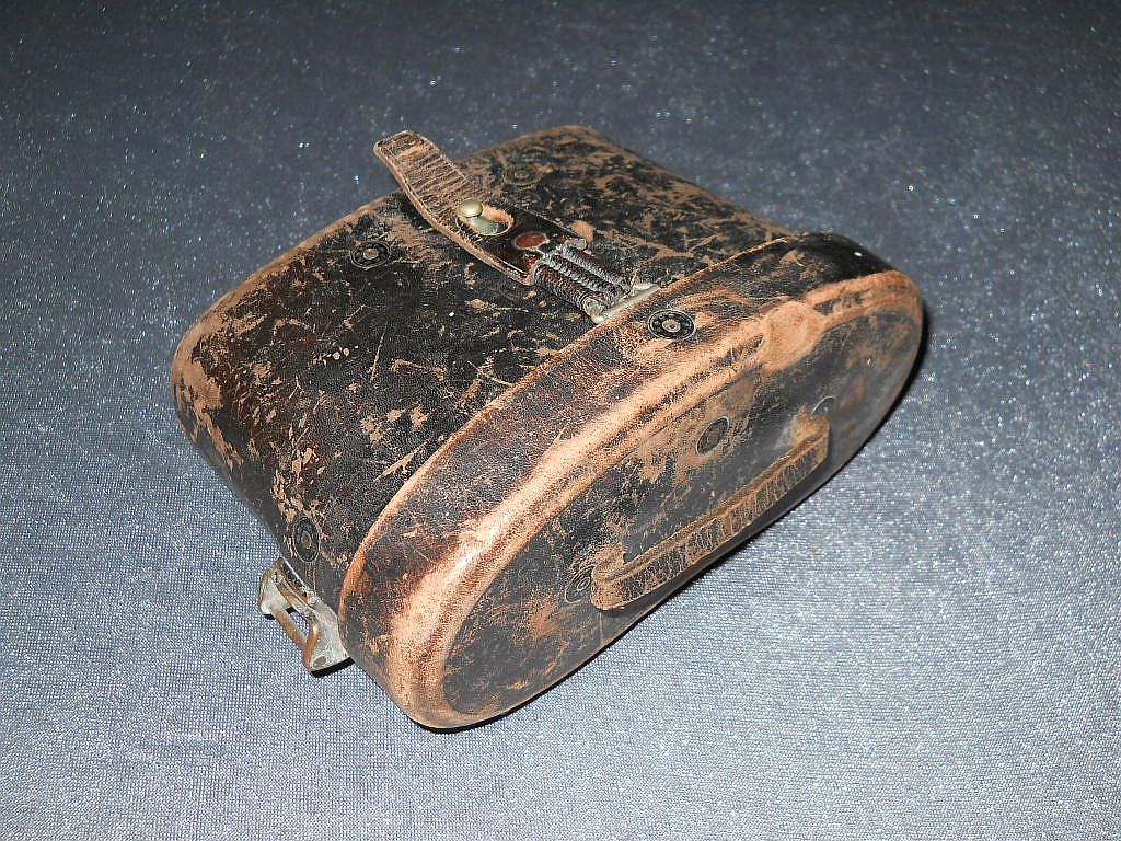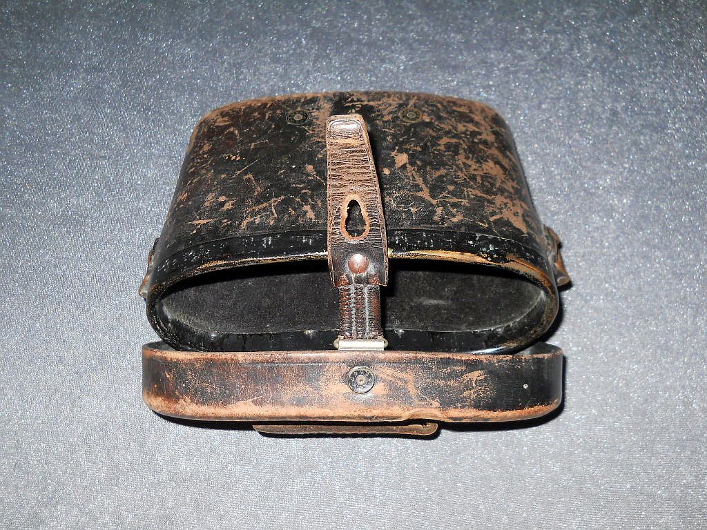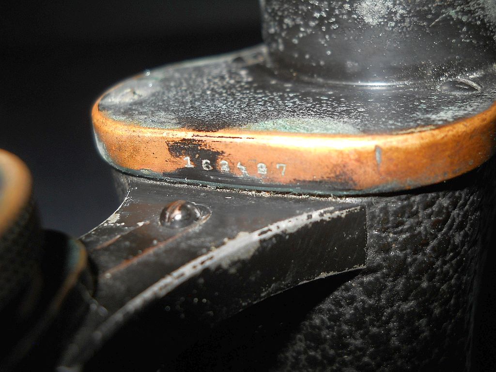 Seriennummer. Das Die große Klemmschraube als miliitärisches Indiz. Die Durchsicht durch das Fernglas. Breite = 14 cm, Höhe = 11 cm, Gewicht = 400 g. Der original militärische Lederköcher. Er ist am Deckelrand mit einer Messinghülse verstärkt.
