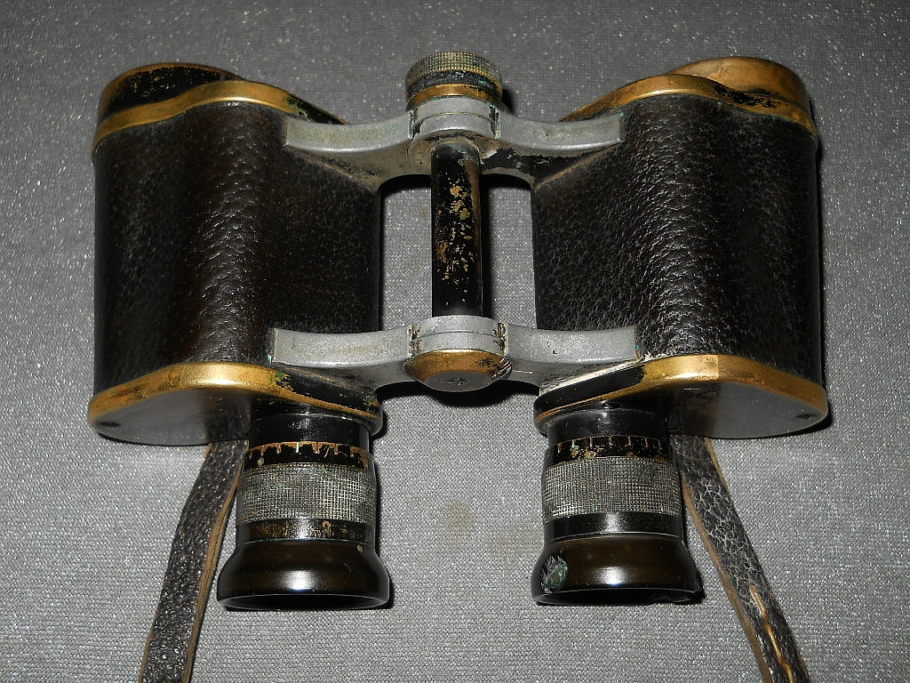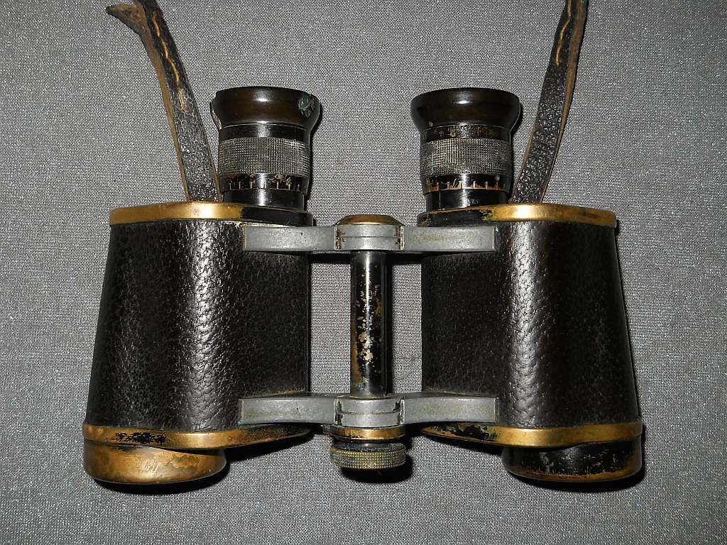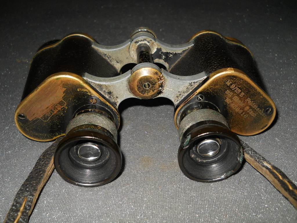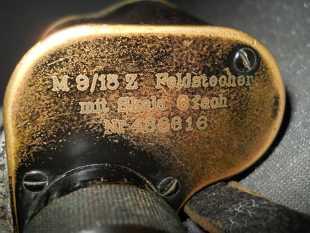 Die Das Fernglas hat die frühe Kreuzrändelung an den Okularen. Die große Klemmschraube als Indiz militärischer Ferngläser. Breite = 16 cm, Höhe = 11,5 cm, Gewicht = 630 g.