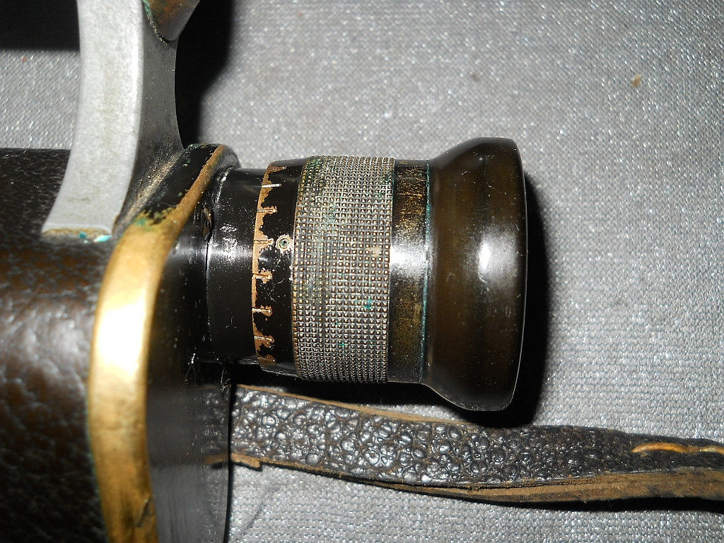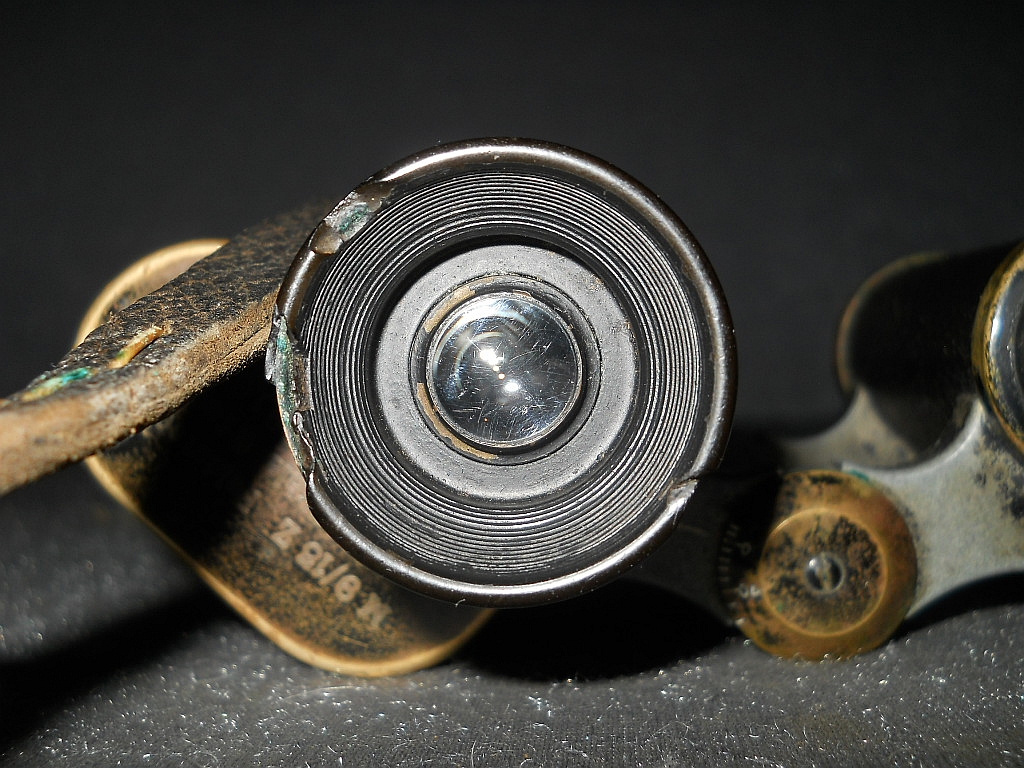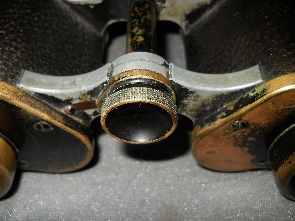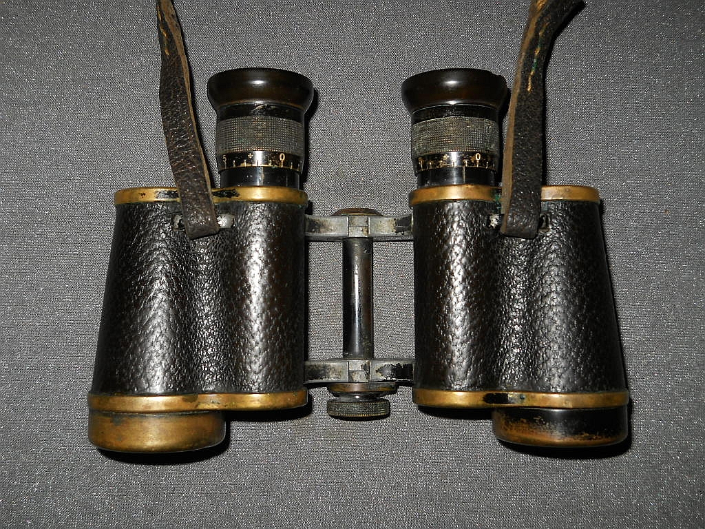 Die Das Fernglas hat die frühe Kreuzrändelung an den Okularen. Die große Klemmschraube als Indiz militärischer Ferngläser. Breite = 16 cm, Höhe = 11,5 cm, Gewicht = 630 g.