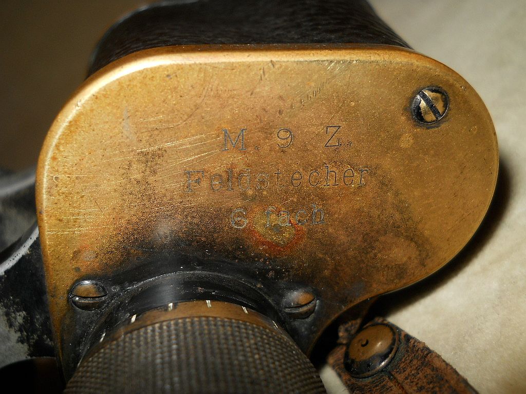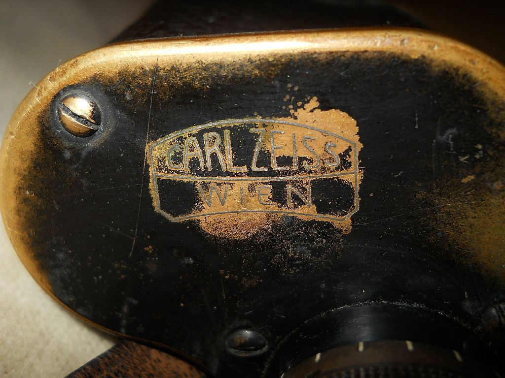gefertigt. Die Objektivstutzen sind 2,3 cm lang und waren ursprünglich beledert. Die Kenngröße 6x30. 6-fache Vergrößerung mit 30 mm Objektive. Das Logo der Zeiss Filiale in Wien. M 9 steht für die Einführung des Modells (1909). Das Z steht für Zeiss. Die Randnummer 170520 ist zugleich auch die