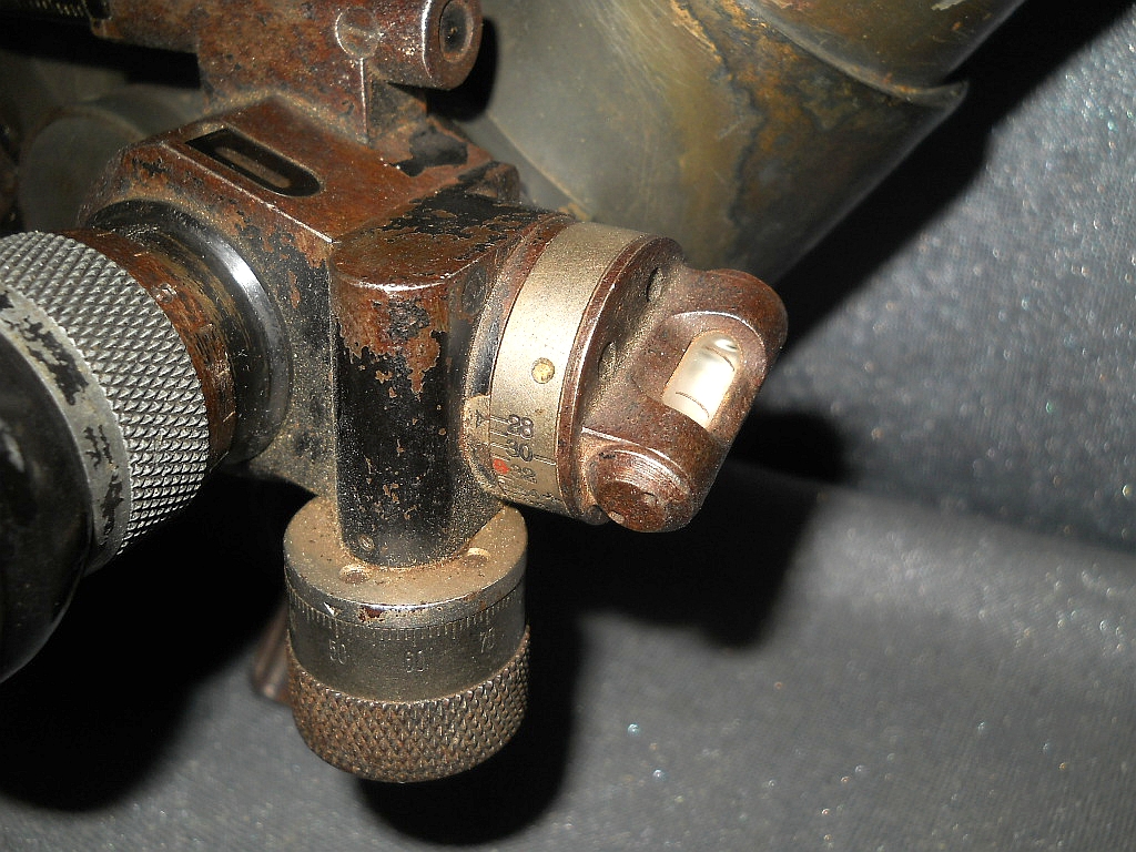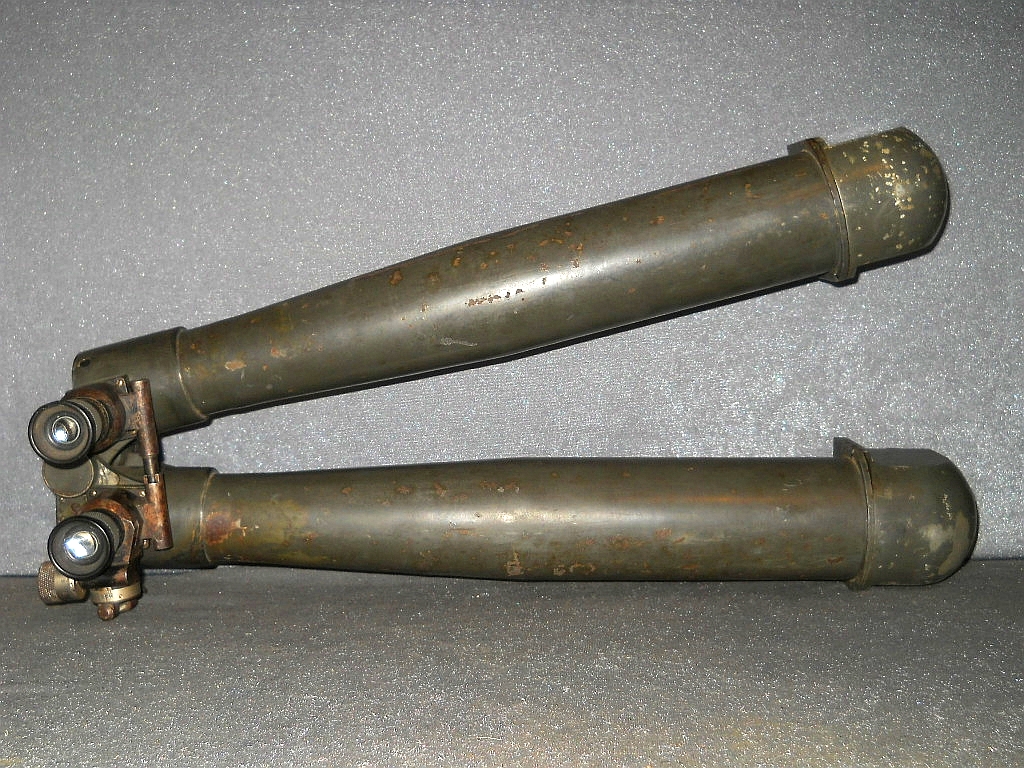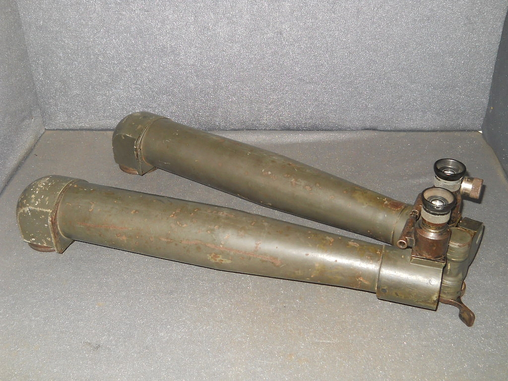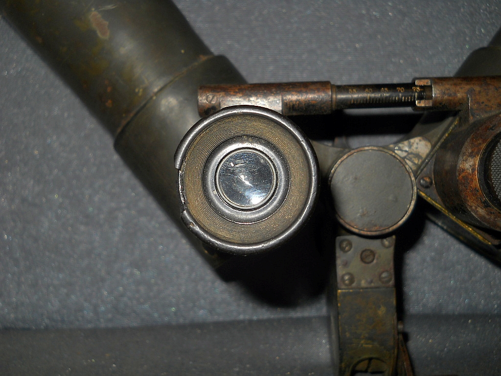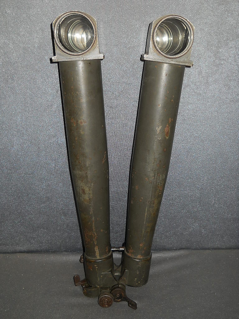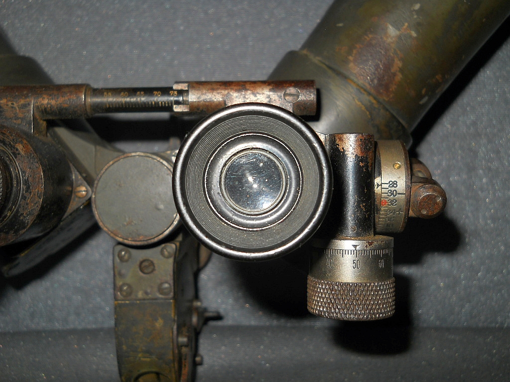 Scherenfernrohr Die Geländemesswinkellibelle mit Stellrad für artilleristische Berechnungen. Die rechte Durchsicht mit Strichplatte. Die linke Durchsicht. Die Strichplatte im Detail. Breite = 18 cm, Höhe = 62 cm, Gewicht = 5500 g.