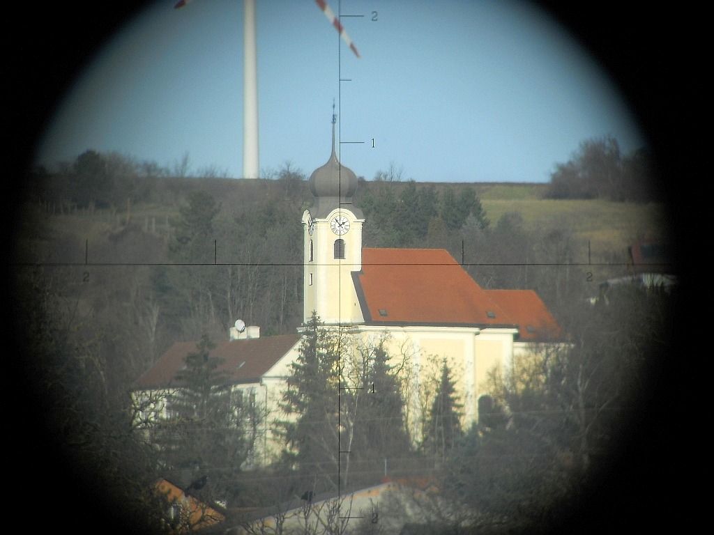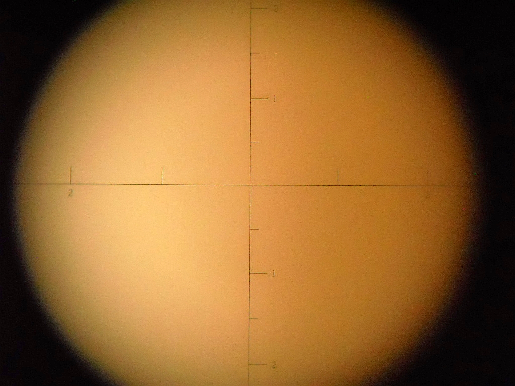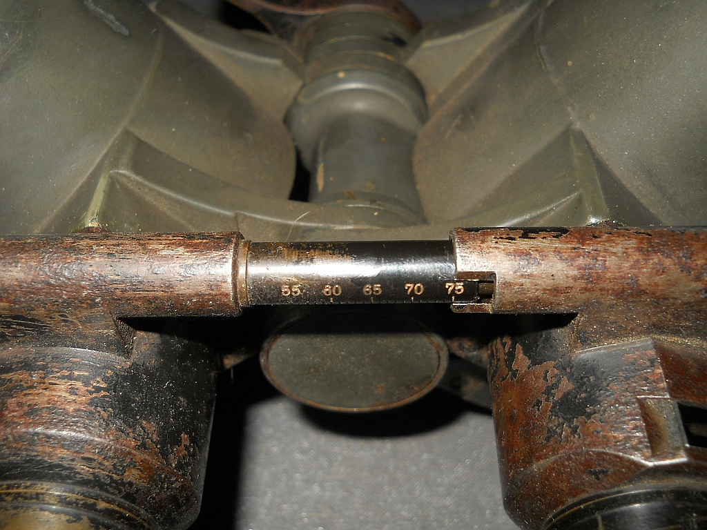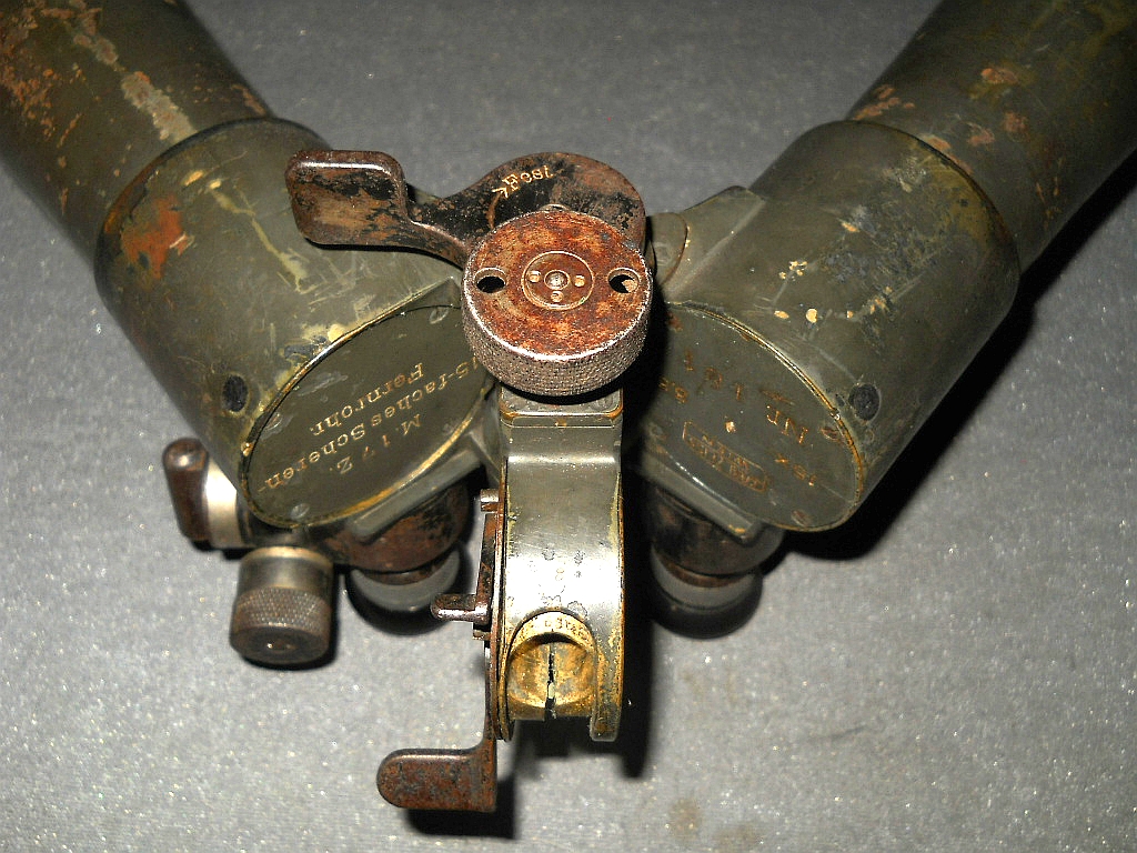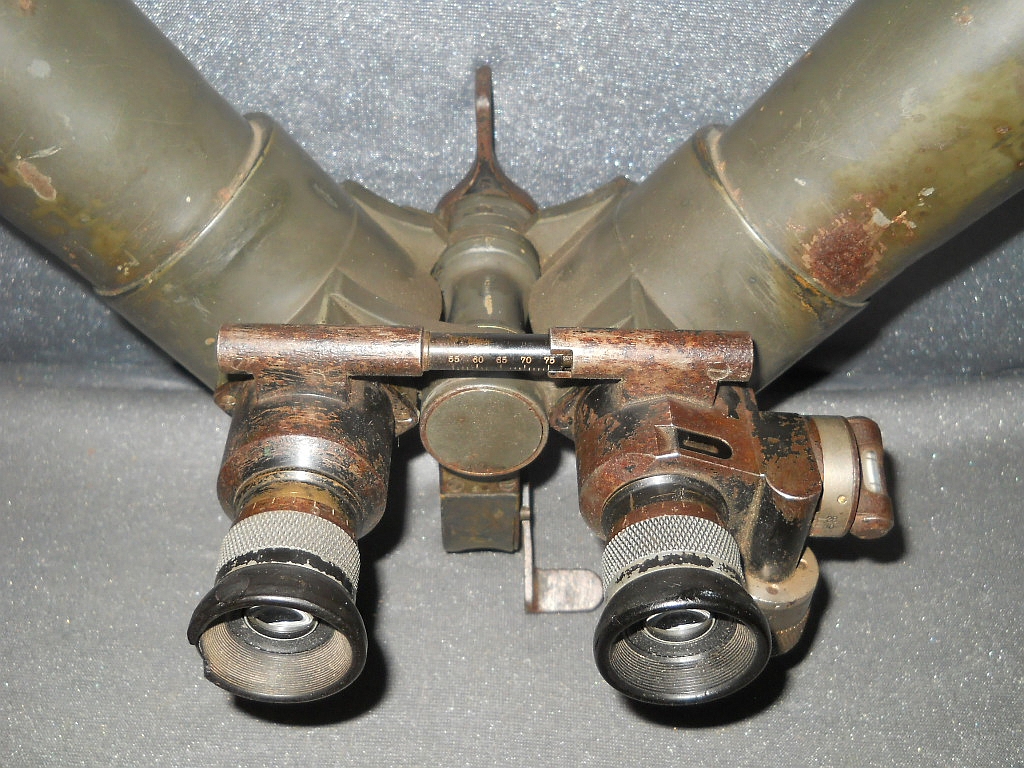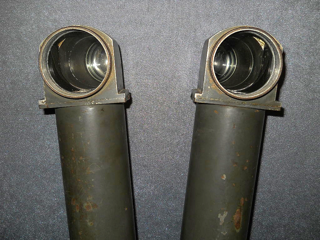 Scherenfernrohr Die Geländemesswinkellibelle mit Stellrad für artilleristische Berechnungen. Die rechte Durchsicht mit Strichplatte. Die linke Durchsicht. Die Strichplatte im Detail. Breite = 18 cm, Höhe = 62 cm, Gewicht = 5500 g.