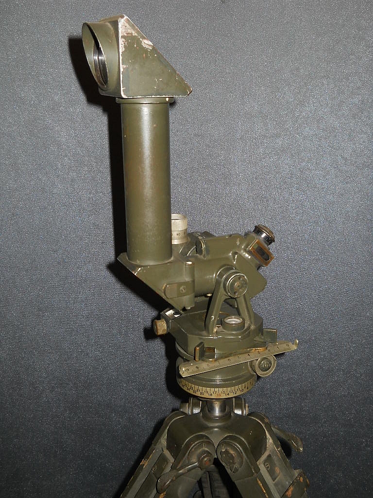 ist Das Fenster für die Strichplattenbeleuchtung. Die Dosenlibelle zur horizontalen Nivellierung des Gerätes. Die Bussole zur Ausrichtung des Seitenwinkels. Die Kompassnadel ist durch Das Rad zur Verstellung des Seitenwinkels. Das Rad zur Verstellung des Höhenwinkels. Die Skala zum Ablesen des Höhenwinkels. Das Objektiv vom Deckungsspiegel mit 40 mm Durchmesser. Die Durchsicht mit Strichplatte. Höhe = 33 cm, Breite = 10,5 cm, Gewicht = 3000 g.