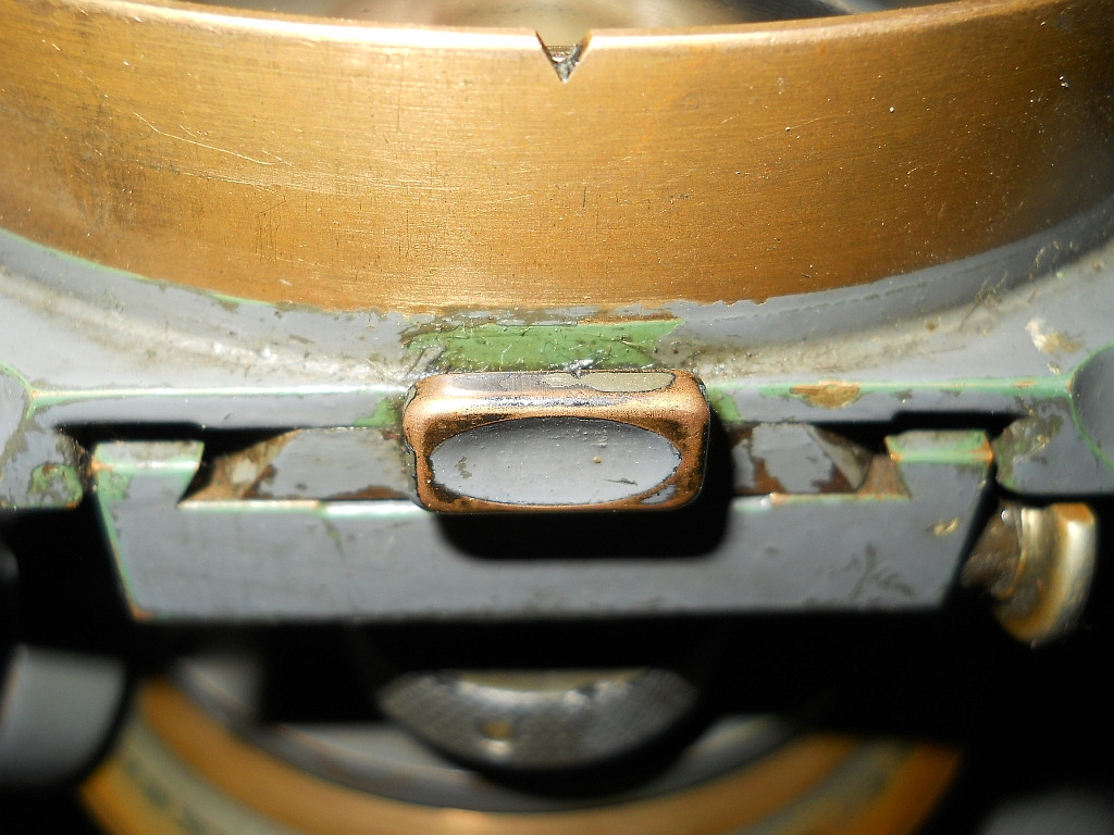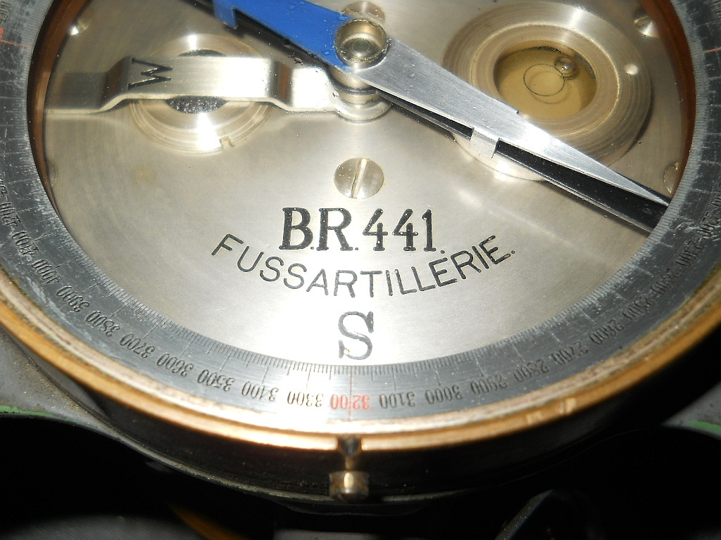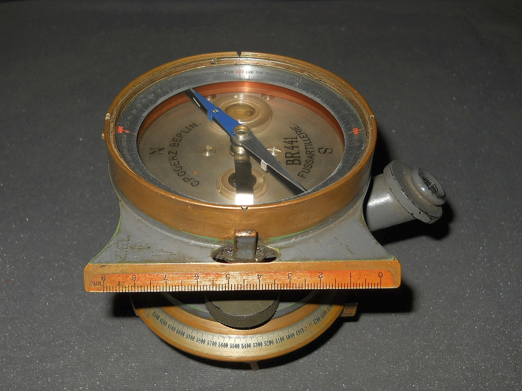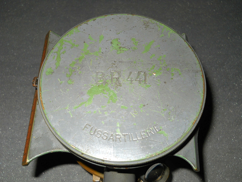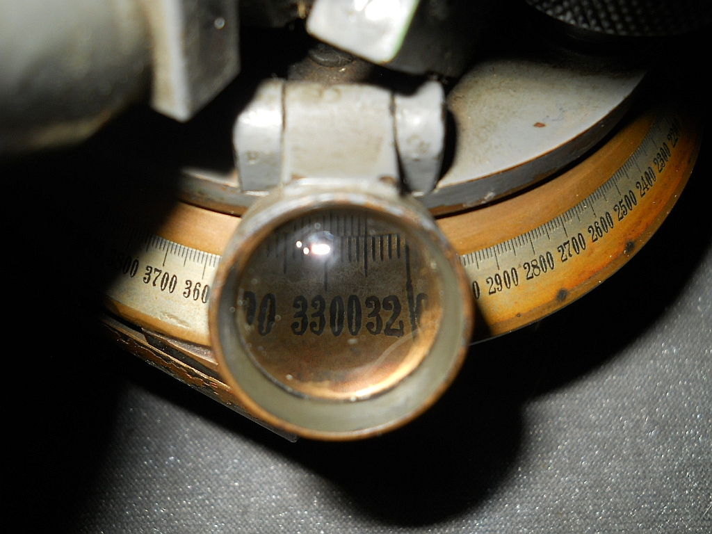Lage abhängig. Kompassabdeckung aus Messing mit Aufschrift und Seriennummer. Die Durchsicht durch den Bussolenrichtkreis mit Strichplatte. Das Fernrohr ist in der Mitte gelagert und nach oben und