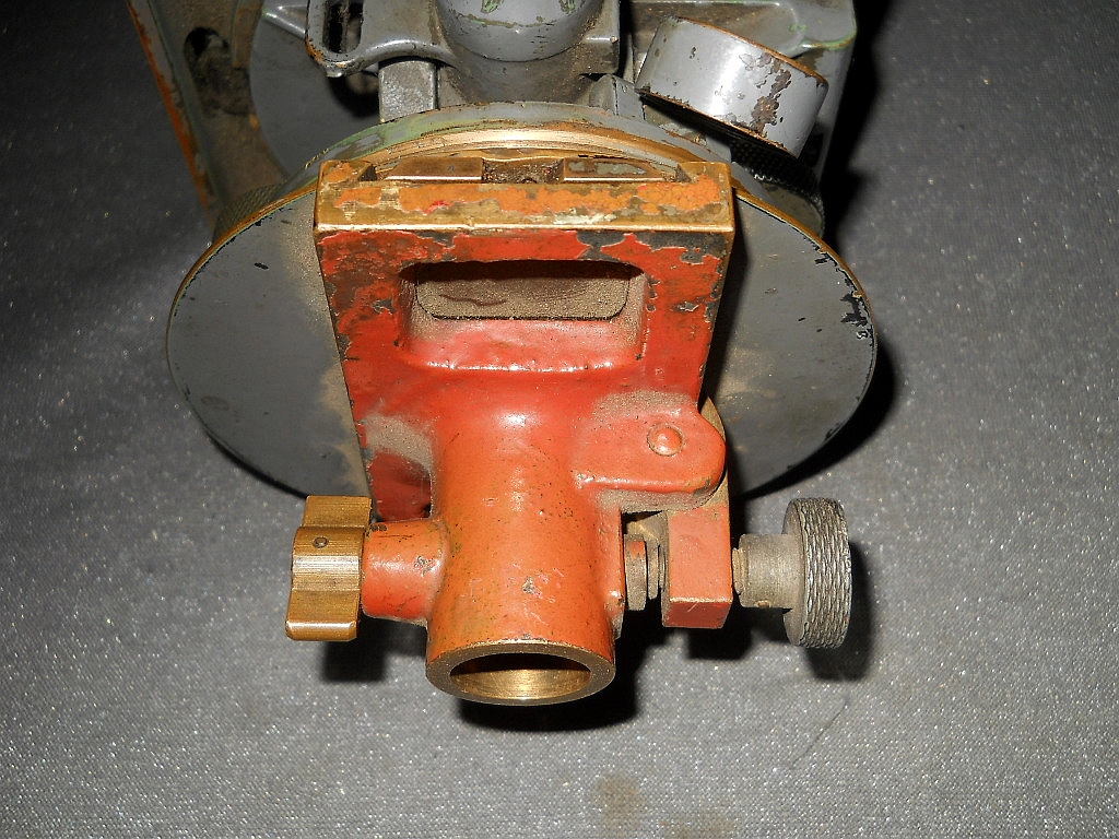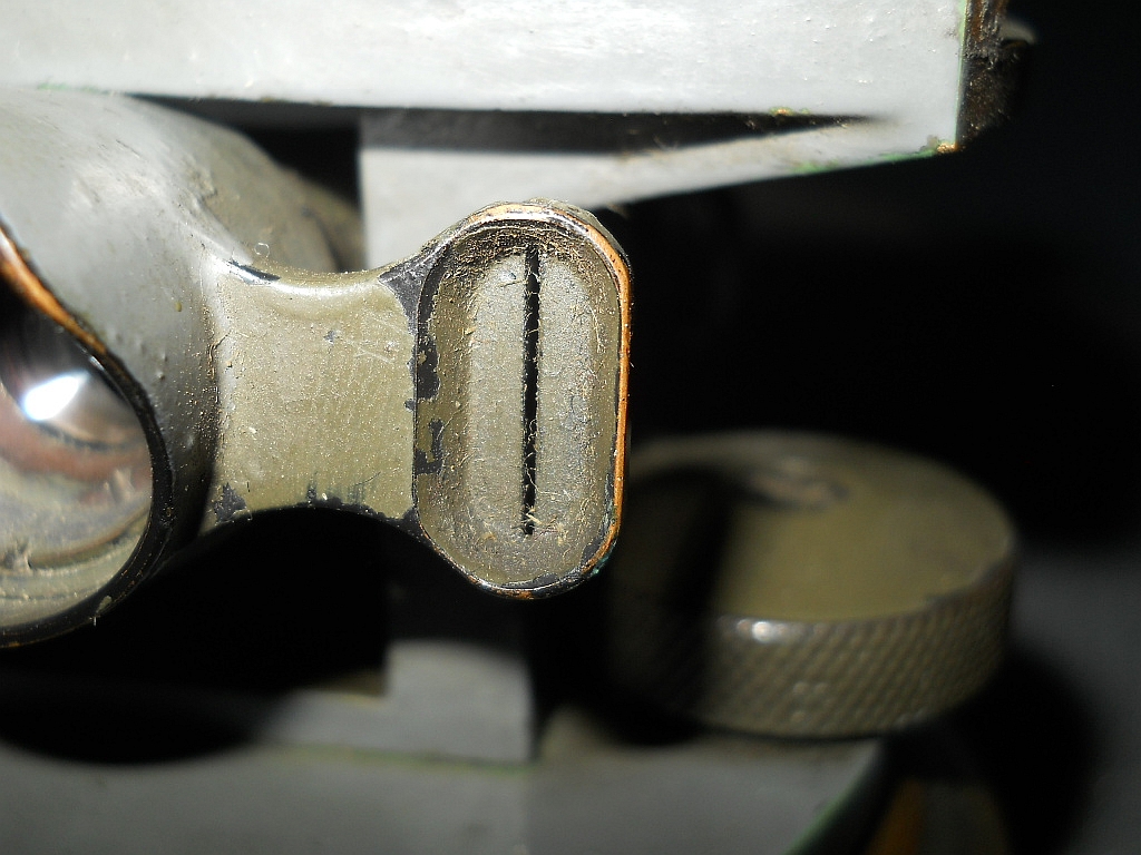 unten schwenkbar. Das Objektiv vom Bussolenrichtkreis. Die Objektivlinse misst 12 mm. Drehrad zur Gradeinstellung am Richtkreis. Einschwenkbare Lupe zur Skalenablesung. Ein Federhebel dient zur Nadelbefestigung für den Transport. Das Grobvisier mit Kimme und Korn in der Ausführung als Fadenvisier. Die Stativaufnahme mit der Befestigungsschraube hat