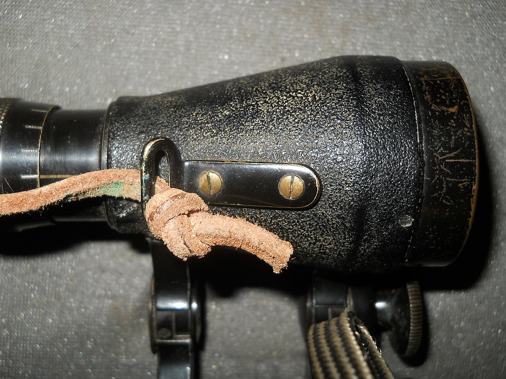Nummern- Die Riemenösen sind geschraubt und noch nicht angegossen. Die Klemmschraube des Ur-Modells ist an der unteren Gelenkachse angebracht. Die Durchsicht durch das Fernglas mit dem für Galileigläser