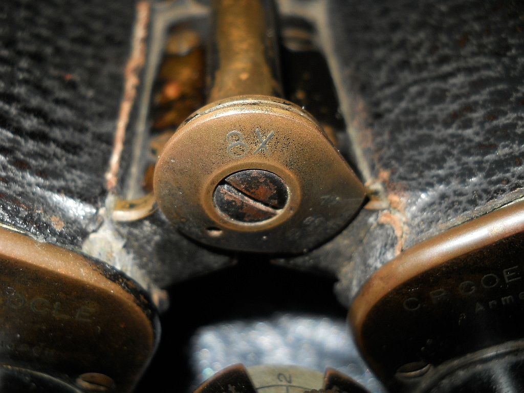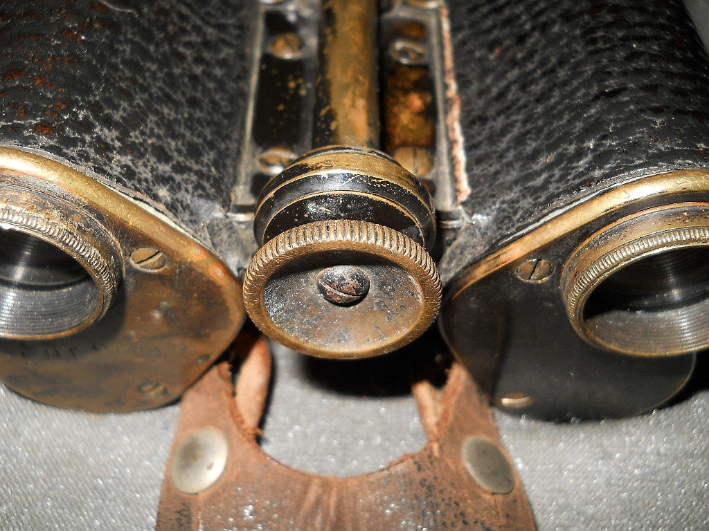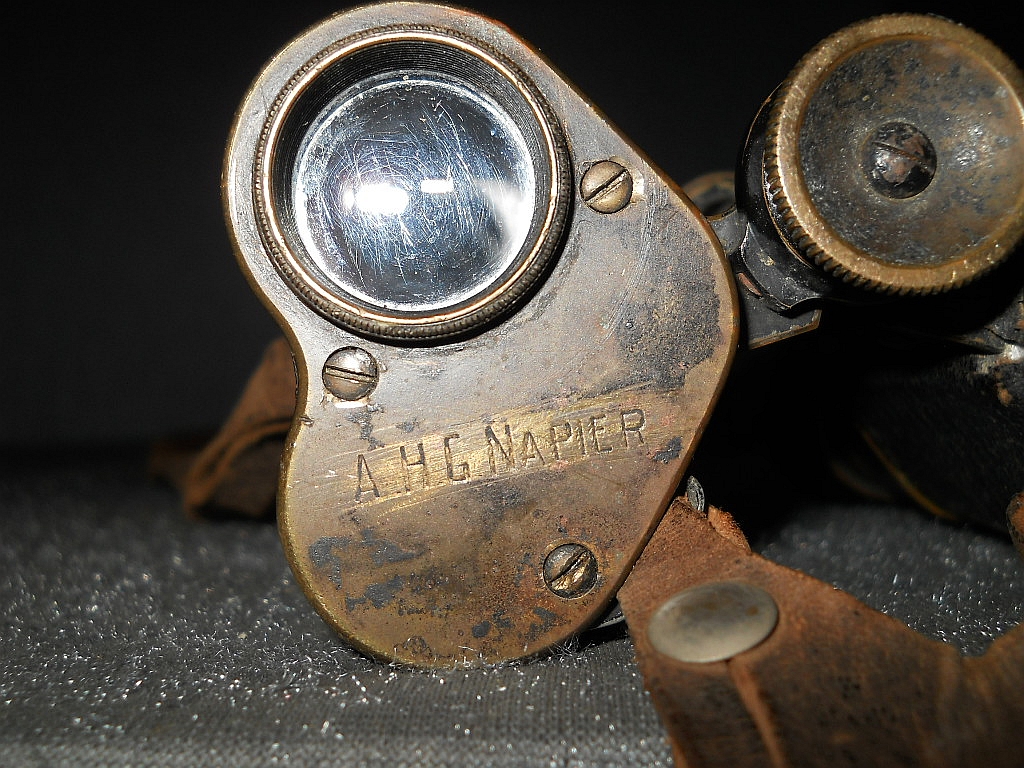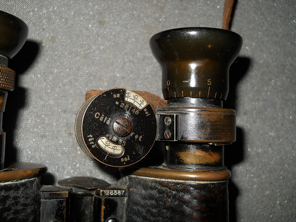 Telemetervorrichtung Durch die aufwändige Bauweise wurden vermutlich nur wenige Kleinserien Beschriftung vom rechten Deckel: C.P. Goerz Berlin - Armee Modell Patent. Beschriftung vom linken Deckel: Trieder Binocle - Telemeter, Lt. Colonel Jonescu. Die Kenngröße ist 8x20. 8-fache Vergrößerung mit 20 mm Objektive. Die Seriennummer ist 126387. Das Fernglas wurde ca. 1906 hergestellt. Die ineinander verschlungenen Buchstaben C.P.G. sind das Kurzlogo von Goerz. An der Unterseite befindet sich die Gravur A.H.G. Napier. Dieser war im WK I Im rechten Objektiv befindet sich ein Doppelfaden, bestehend