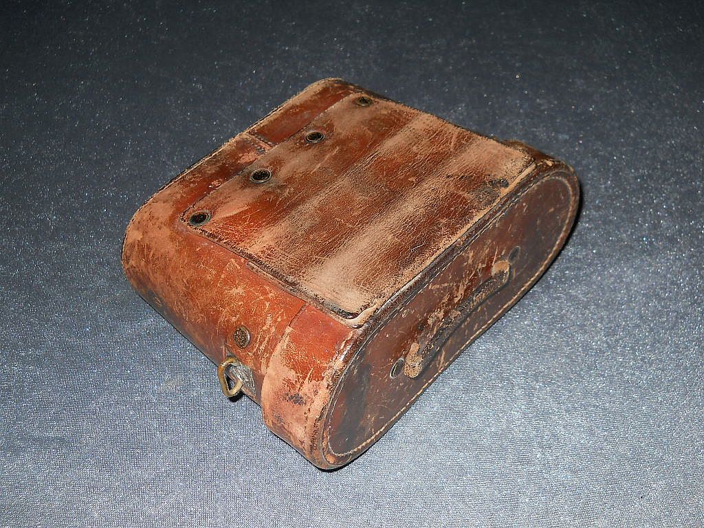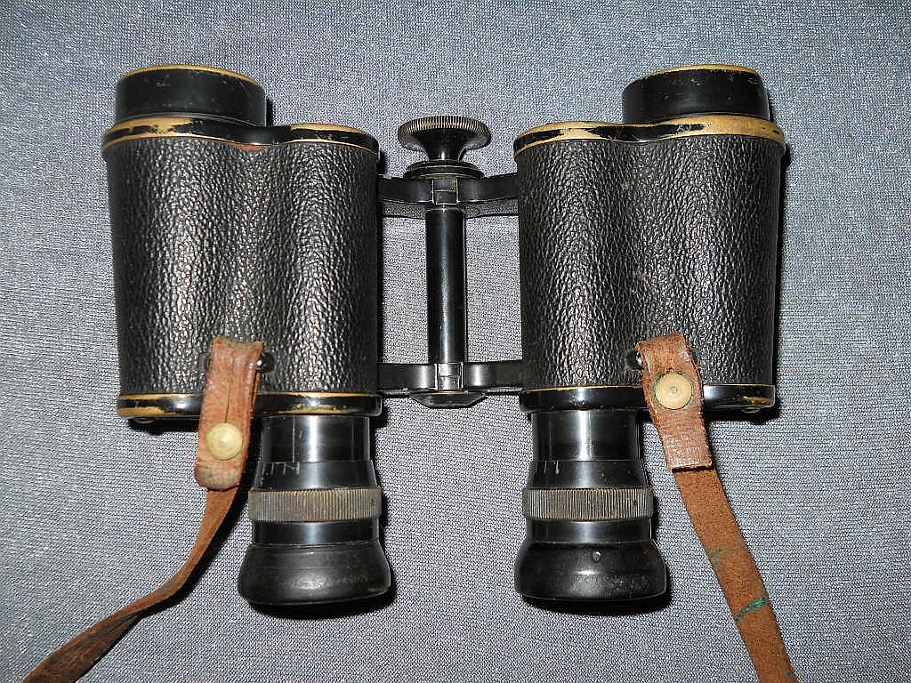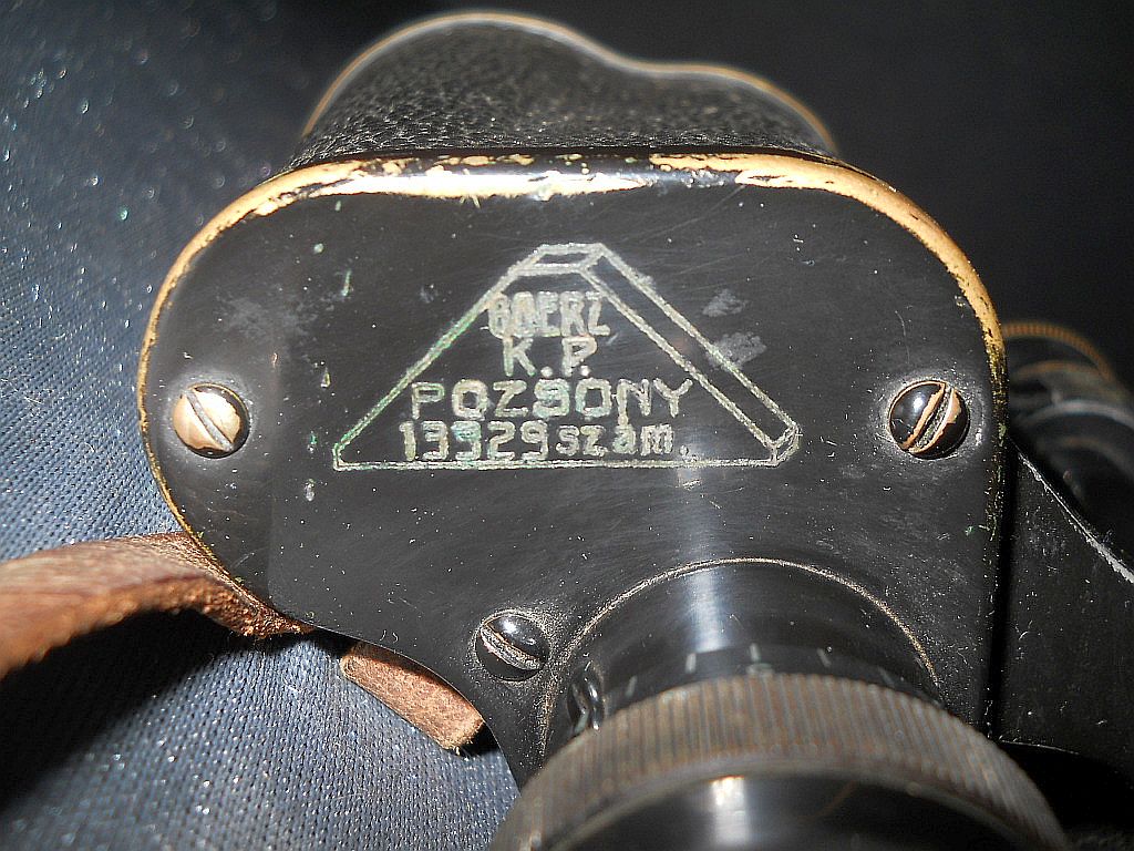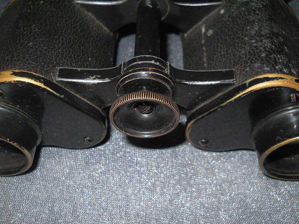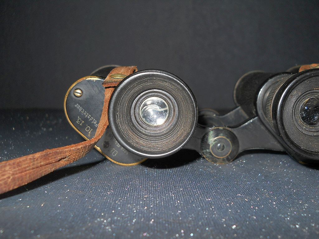 Die Der M9 Feldstecher ist das Modell von 1909. Die ÜK-Abnahme ist vom 8.10.1913. Die Klemmschraube zum Fixieren der Augenweite. Die Durchsicht mit K.u.K. Strichplatte. Das Detail der Strichplatte. Breite = 16 cm, Höhe = 12 cm, Gewicht = 720 g. Der original militärische Lederköcher. Der Deckelrand ist mit einem Messingring verstärkt.