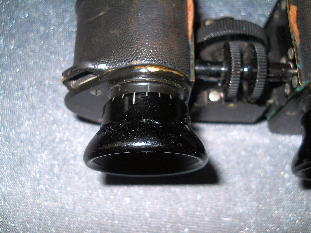 Einstellung der Der Diotrienausgleich befindet sich am rechten Okular. Die Durchsicht durch das Fernglas. Breite = 11,5 cm, Höhe = 7 cm, Gewicht = 420 g. Der original Lederköcher. Er ist innen mit blauen Samt ausgelegt.