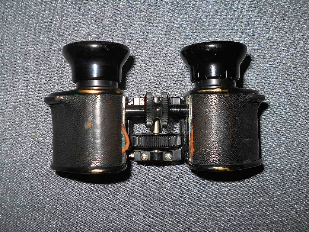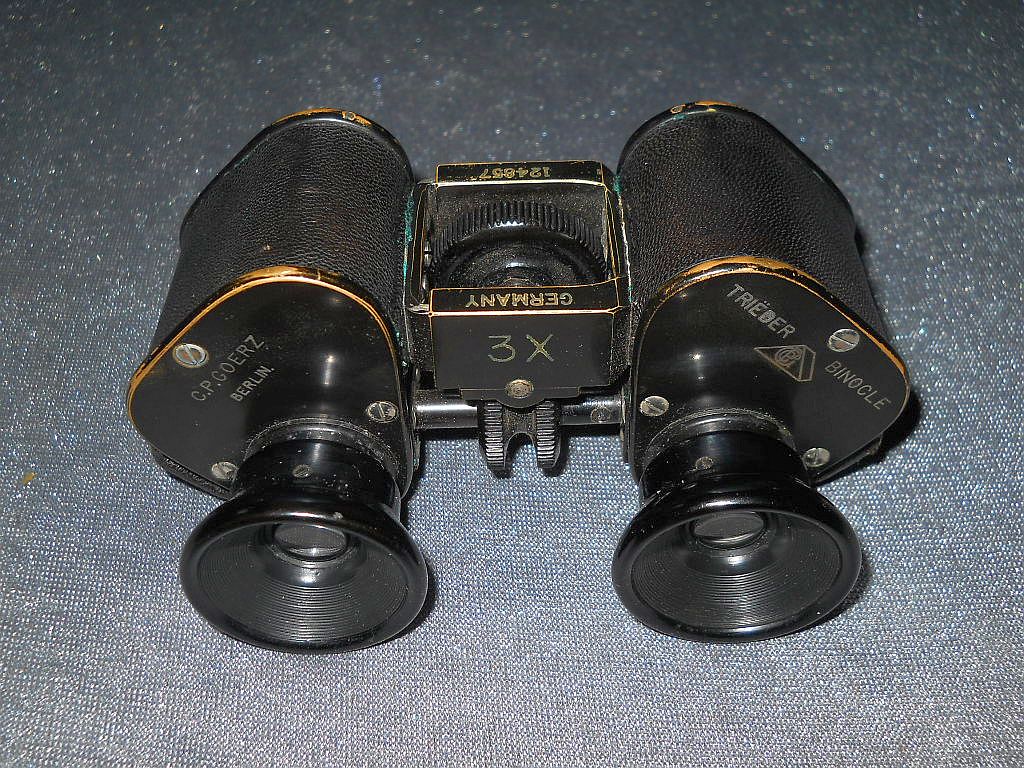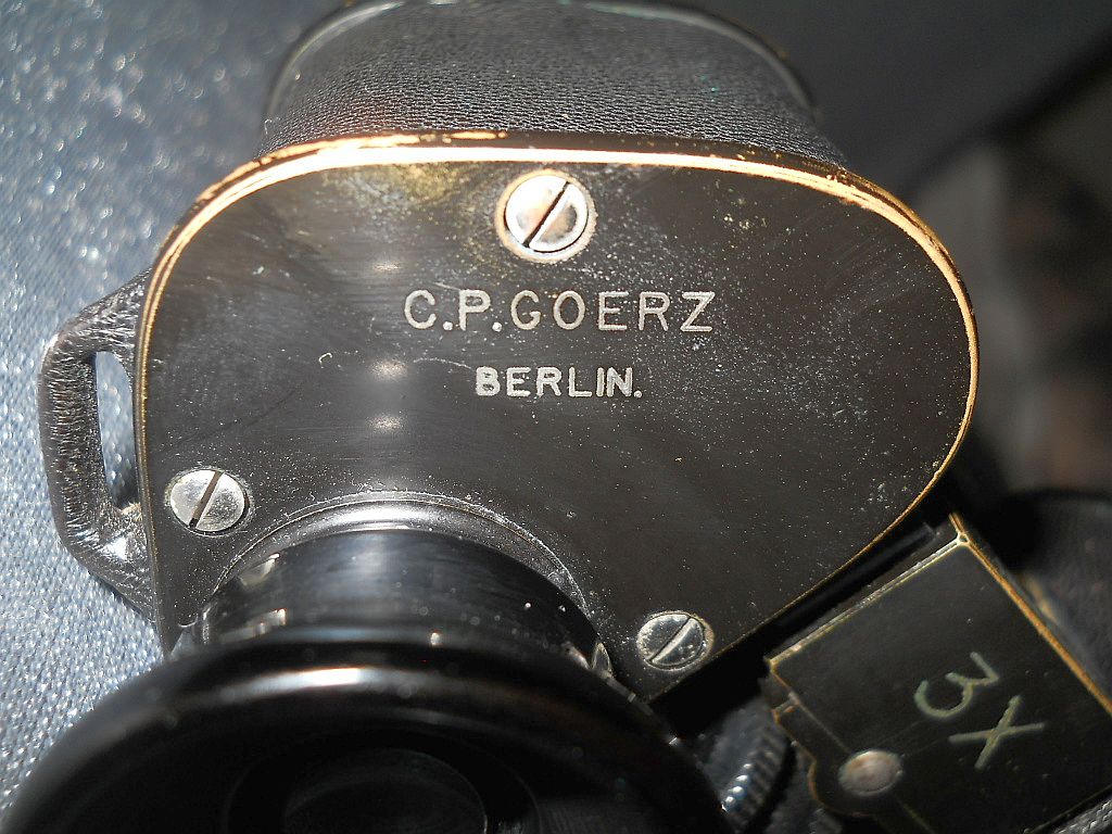 den verschlungenen In der Mitte befindet sich die Vergrößerungsangabe 3x. Die Seriennummer ist 124857. Das Fernglas wurde 1906 hergestellt. Das Kurzlogo von Goerz. Es hat eine einzigartige Konstruktion der Fokussierung und