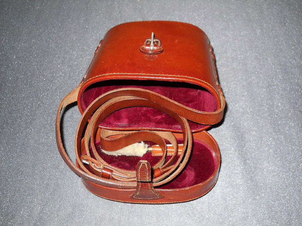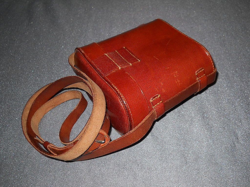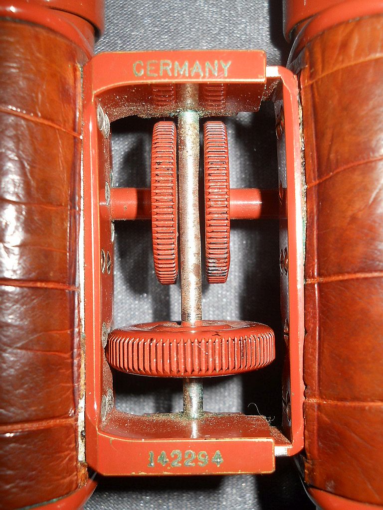 Zahnradmechanismus. Der Dioptrienausgleich befindet sich am rechten Okular. Die Durchsicht durch das Fernglas. Breite = 11,5 cm, Höhe = 11,5 cm, Gewicht = 520 g. Der original Lederköcher. Er ist innen mit weinroten Samt ausgelegt.