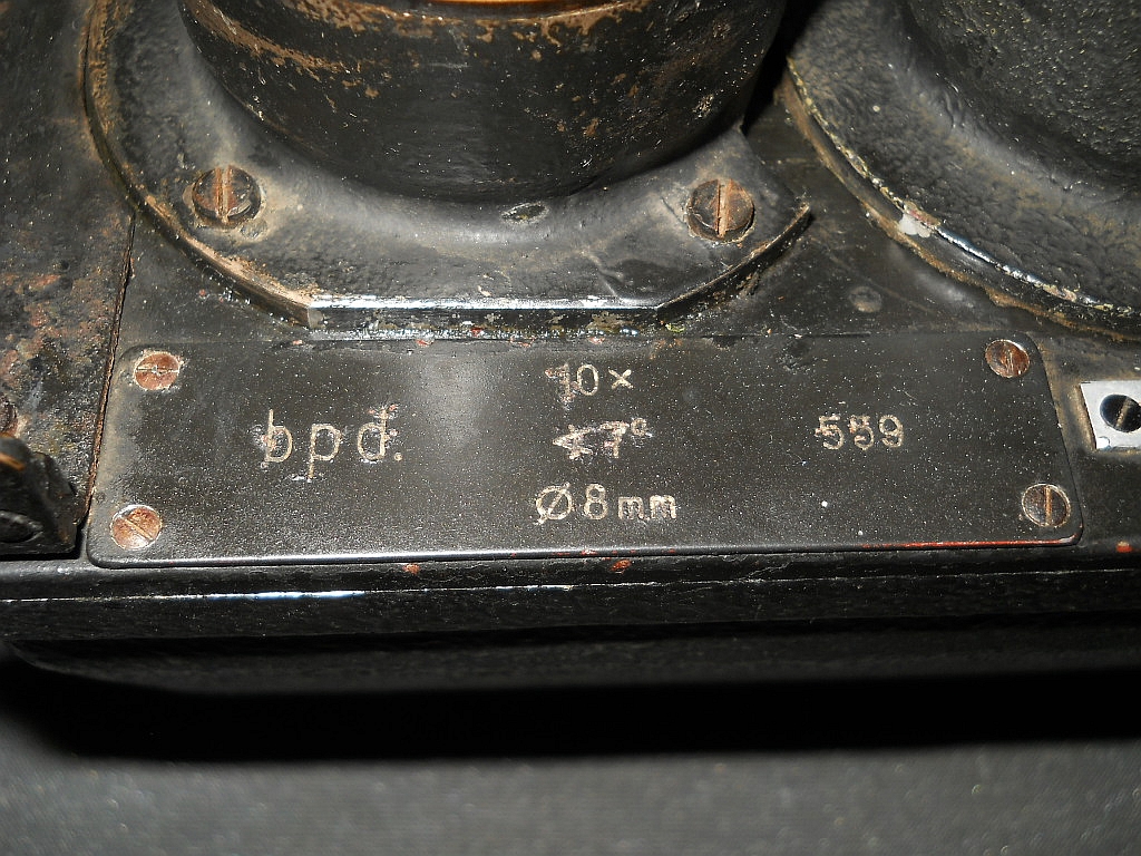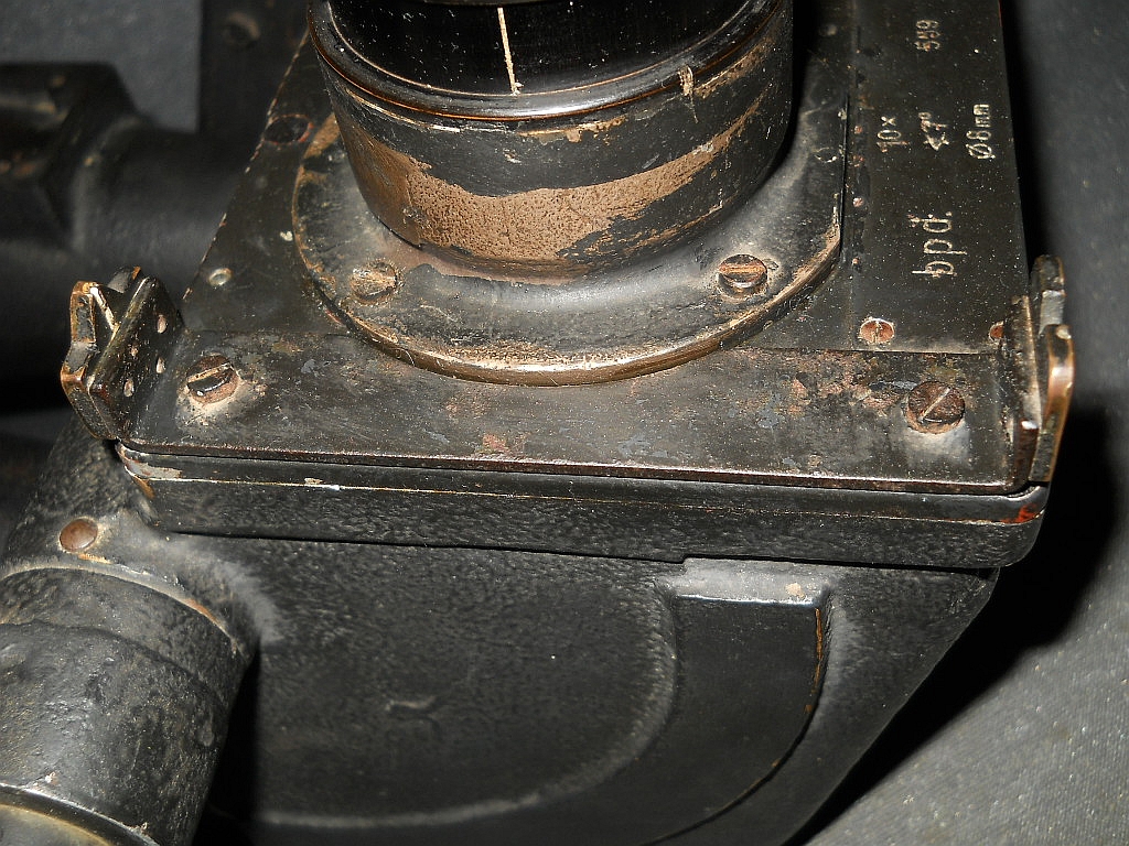 Okularlinsen messen Das Rad zur Einstellung des Augenabstandes. Die Skala vom Augenabstand. Das Fenster für die Strichplattenbeleuchtung. Das aufgeschraubte Grobvisier mit Kimme und Korn. Die Unterseite vom Flakglas mit Wiege. Die Durchsicht rechte Seite mit Strichplatte. Die Durchsicht linke Seite. Breite mit Wiege = 30 cm, Korpusbreite = 18 cm, Länge = 30 cm, Gewicht = 6850 g. Die Optik ist nicht vergütet. Dieses Modell wurde baugleich auch von der ungarischen Firma MOM hergestellt.