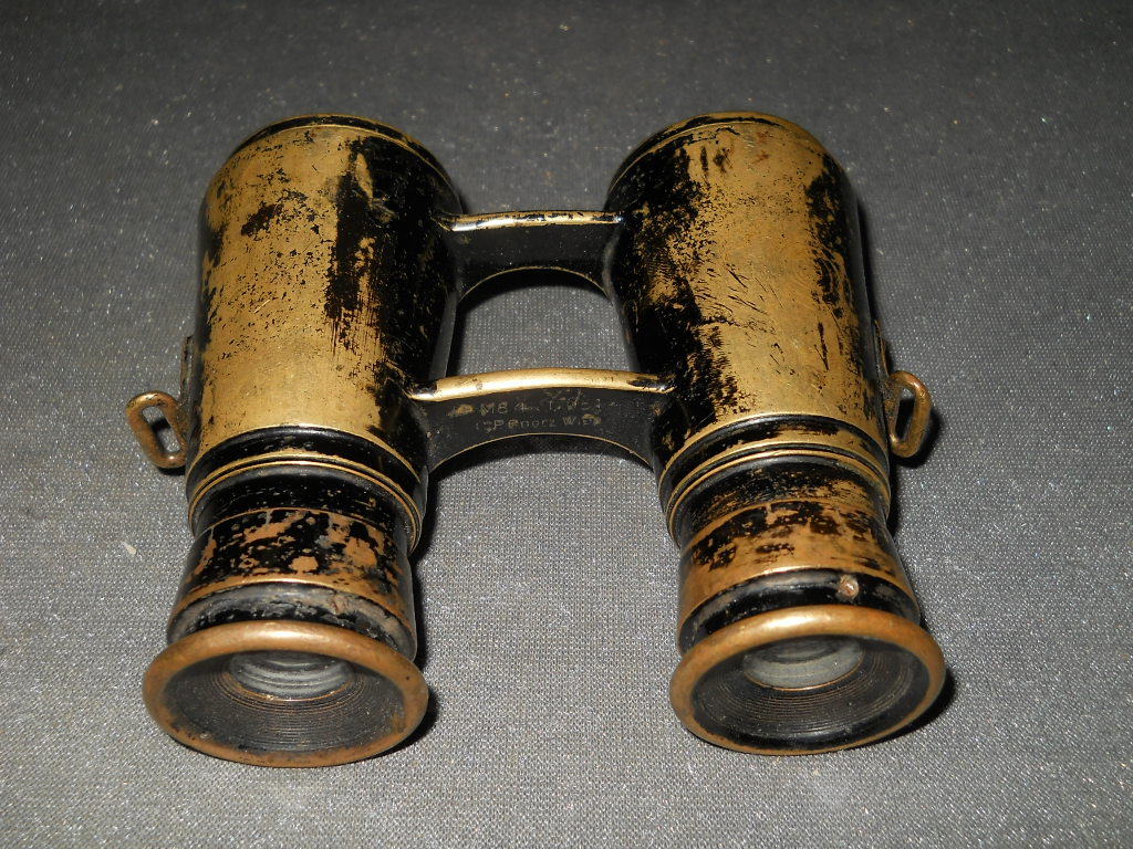 Die Okular und Augenmuschel sind aus einem Stück aus Messing gefertigt. Es hat angenietete Riemenösen. Die Durchsicht durch das Fernglas. Charakteristisch für