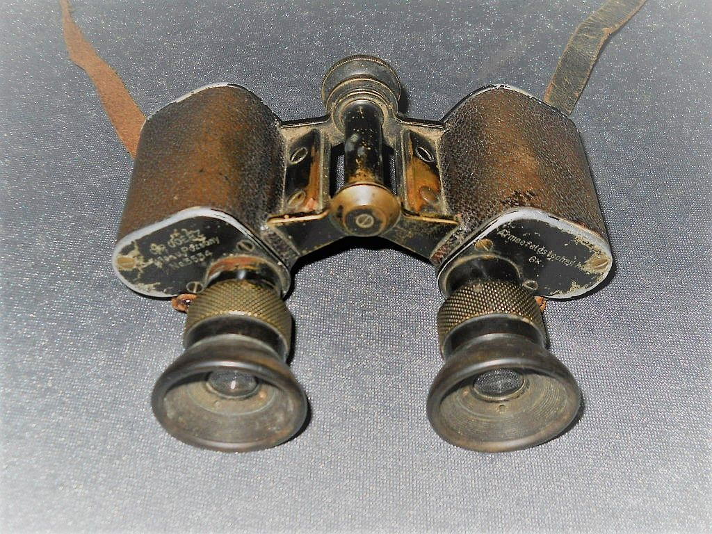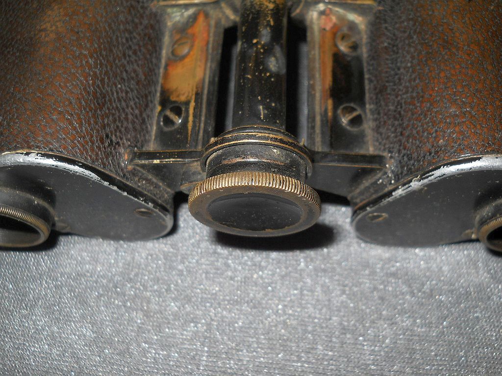 Teil ist drehbar. Die Riemenösen sind geschraubt. Die Klemmschraube zum Fixieren des Augenabstandes. Die linke Durchsicht durch das Fernglas. Breite = 13,5 cm, Höhe = 10,5 cm, Gewicht = 440 g. Der militärische Lederköcher mit Leibriemen. Er ist am oberen Rand mit einer Messinghülse verstärkt.