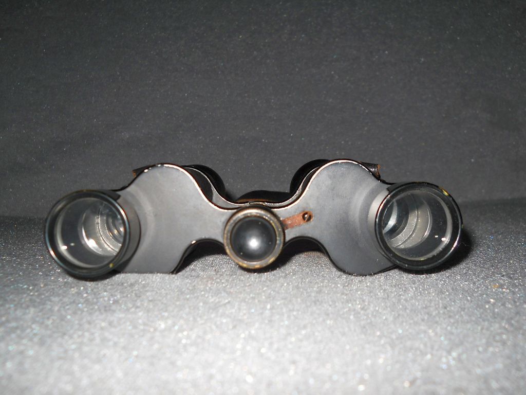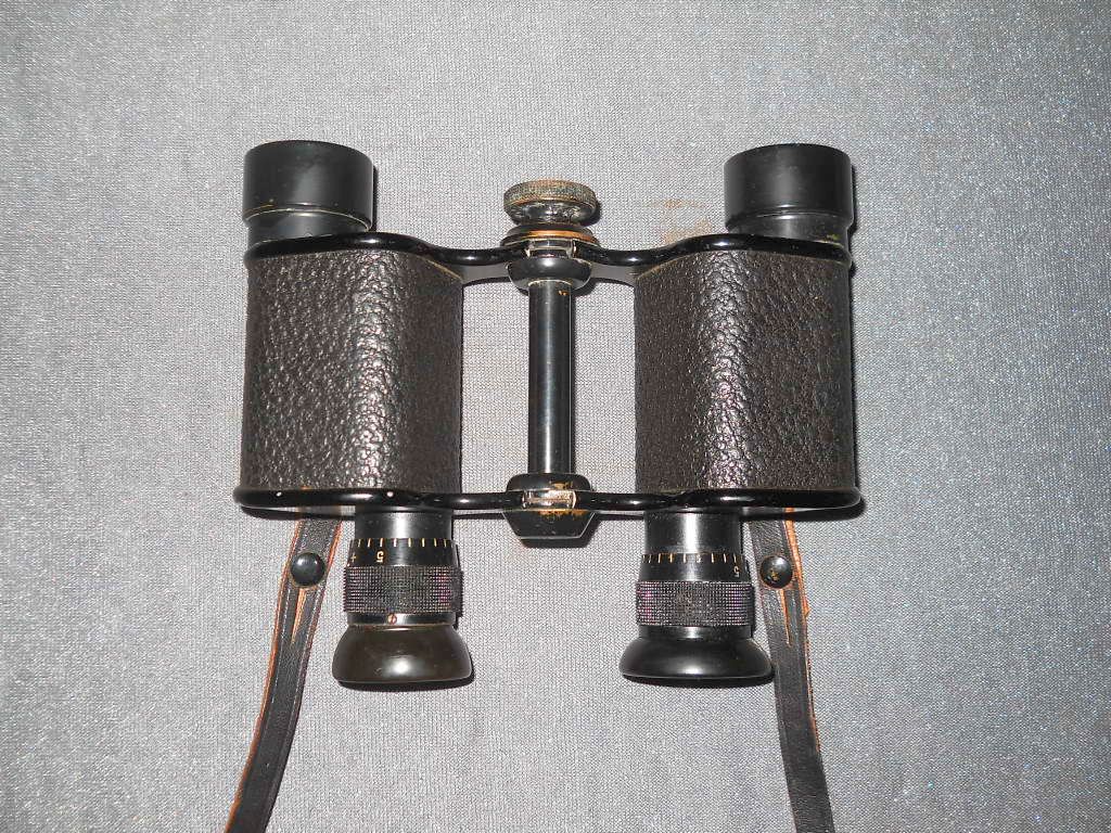 leicht gebogenen Die Okulare sind mit Kreuzrändelung. Das Fernglas hat geschraubte Riemenösen. Die Klemmschraube zum Fixieren der eingestellten Augenweite. Die Gehäusedeckeln oben und unten sind aus zwei Teilen und bilden zugleich Die Durchsicht durch das Fernglas. Breite = 14 cm, Höhe = 12 cm, Gewicht = 510 g. Der original Lederköcher.