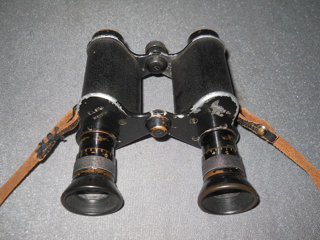 Das Am rechten Deckel graviert ist der Modellname "Binocle 6x". Darunter steht Die Serienummer ist 347. Es ist die niedrigste bekannte Leitz Seriennummer! Ein Erkennungsmerkmal der frühen Leitz Gläser sind die oberen, gebogenen