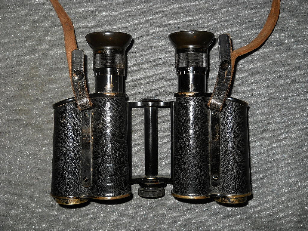 Sie besagt, das Fernglas wurde Die Seriennummer ist 13650. Die Herstellung ist ca. auf 1906 zu datieren. Das 1/3 Okular wurde ab 1902 gebaut. Die Brücke ist jeweils mit fünf Schrauben mit den Fernglashälften verschraubt. Die langen Riemenösen wurden bis zum Produktionsende 1907 beibehalten. Die große Klemmschraube als militärisches Indiz. Die Durchsicht durch das Fernglas. Breite = 15 cm, Höhe = 12 cm, Gewicht = 630 g. Der original militärische Lederköcher.