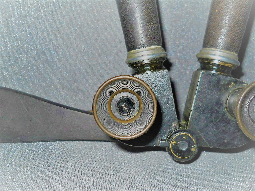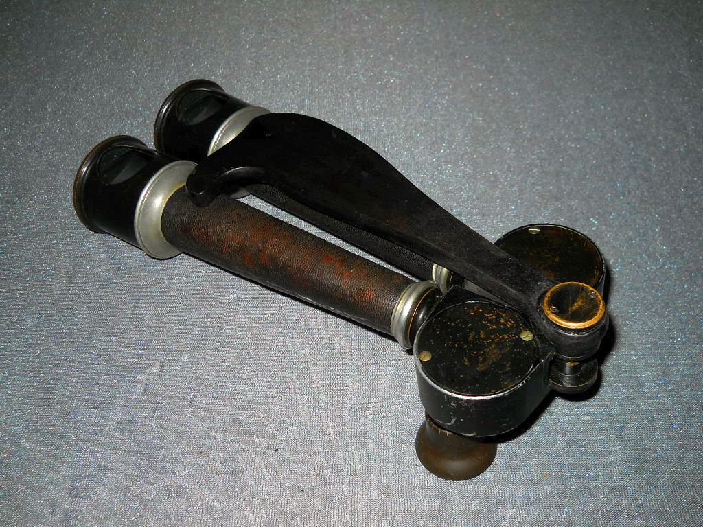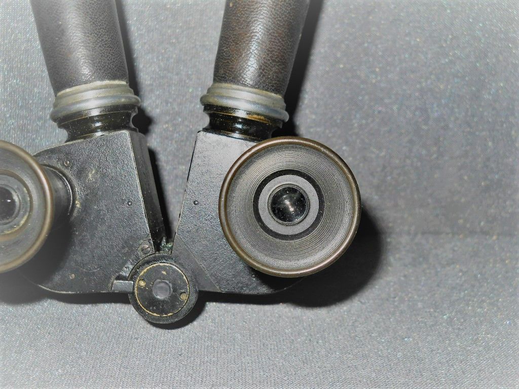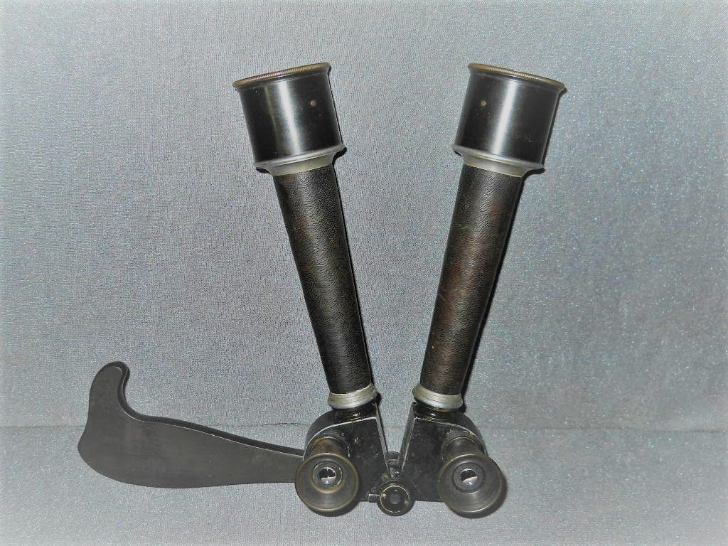 Zusammengelegt in Transportstellung. Die eingeschnittene Schreibschrift ist ohne Silberlotauslegung. Die Kenngröße ist 10x25. 10-fache Vergrößerung mit 25 mm Objektive. Die Seriennummer ist 261. Herstellung um 1895/96. Die geschraubte Brücke. Die Brücke ist nicht verbreitert. Die glatten 3/3 Augenmuscheln mit Finderteilung. Die frühen Relieffernrohre haben einen runden Ausblick. Der Ausblick kann mit einer drehbaren Hülse zum Schutz vom