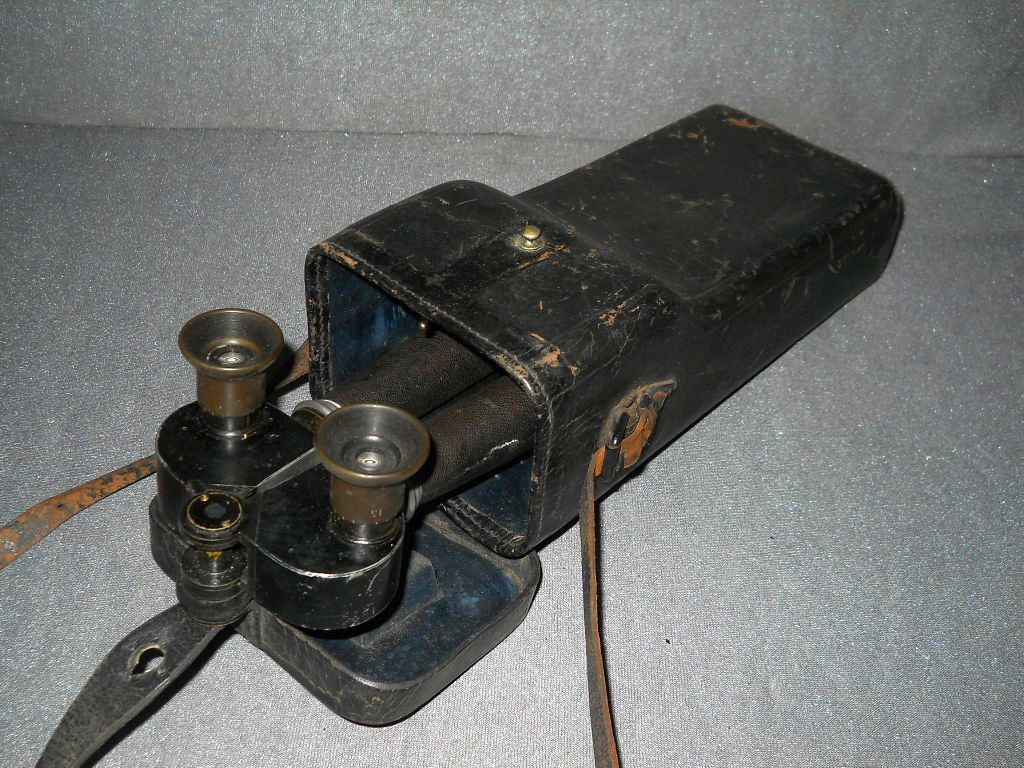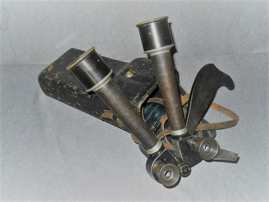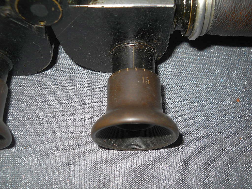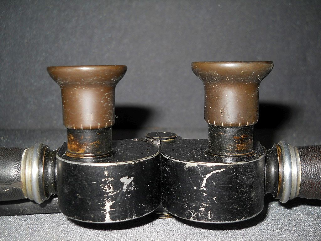 Zusammengelegt in Transportstellung. Die eingeschnittene Schreibschrift ist ohne Silberlotauslegung. Die Kenngröße ist 10x25. 10-fache Vergrößerung mit 25 mm Objektive. Die Seriennummer ist 261. Herstellung um 1895/96. Die geschraubte Brücke. Die Brücke ist nicht verbreitert. Die glatten 3/3 Augenmuscheln mit Finderteilung. Die frühen Relieffernrohre haben einen runden Ausblick. Der Ausblick kann mit einer drehbaren Hülse zum Schutz vom