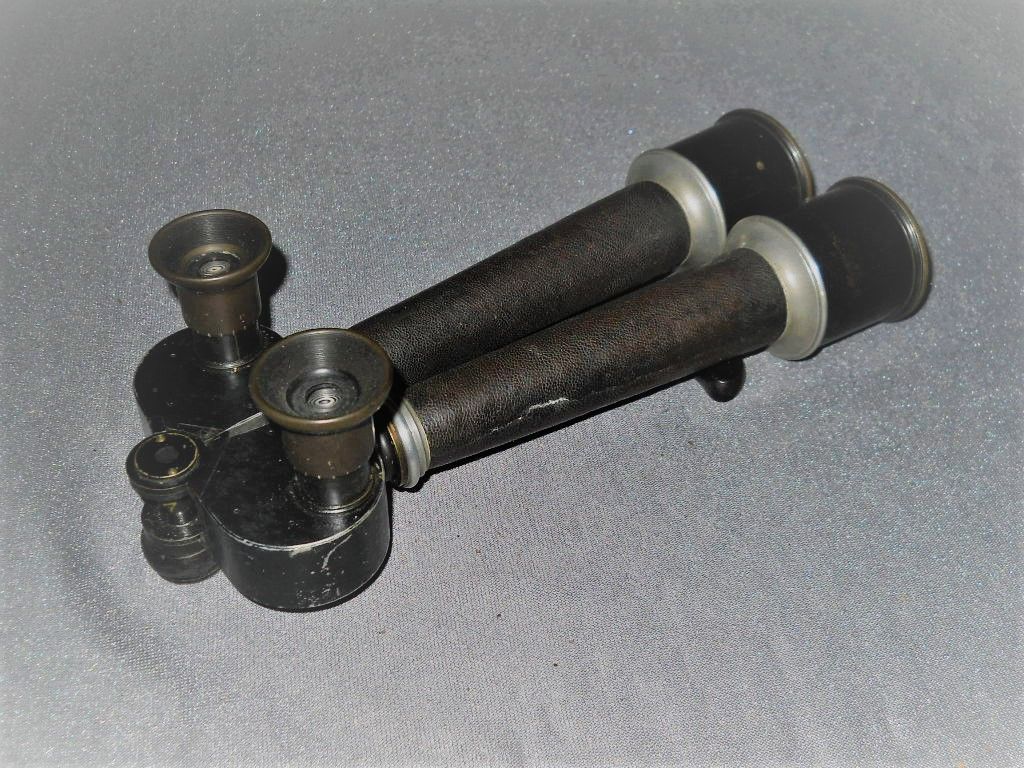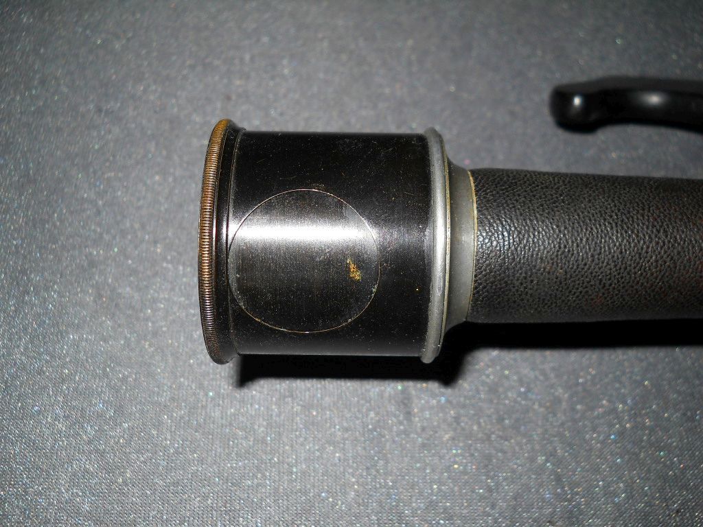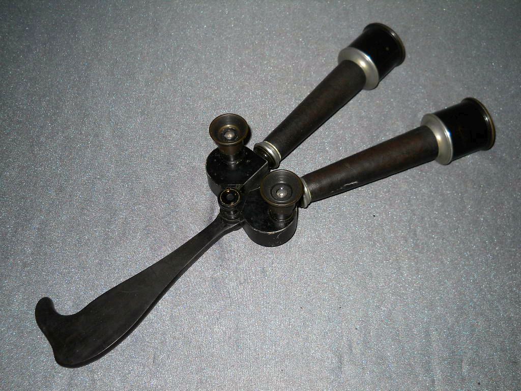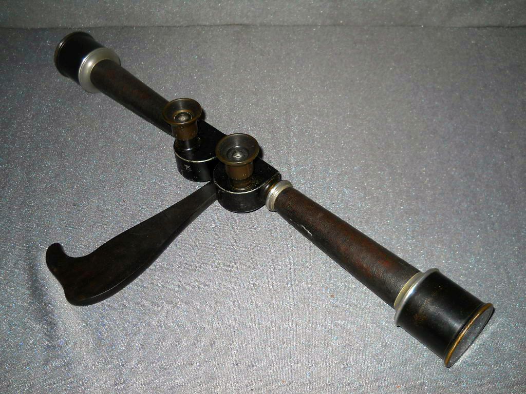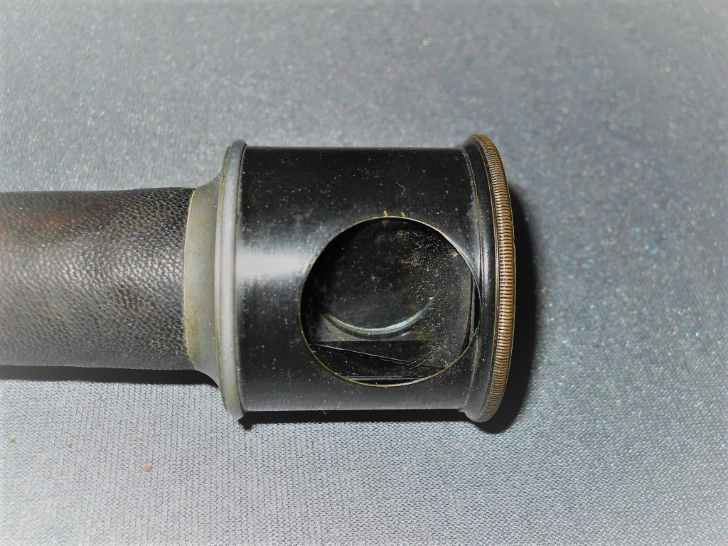Objektiv Der geschwungene Haltegriff. Die Durchsicht durch das Relieffernrohr. Höhe mit Haltegriff = 40 cm, Breite mit augeklappten Armen