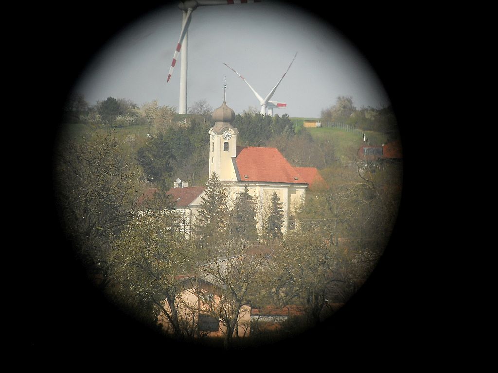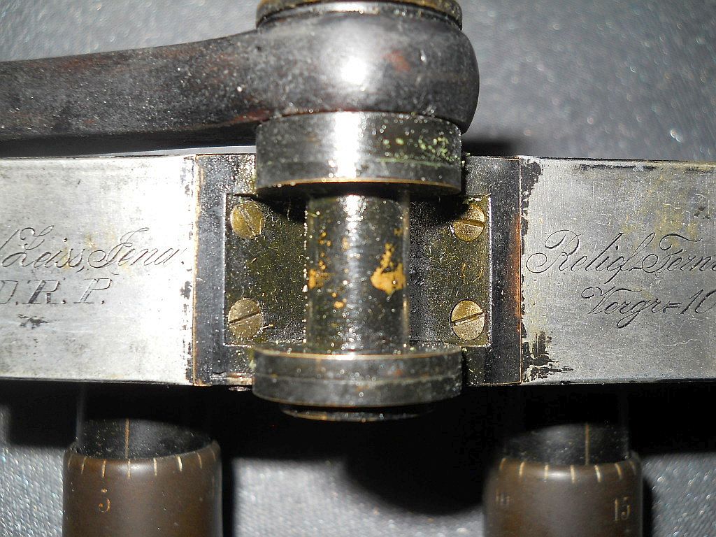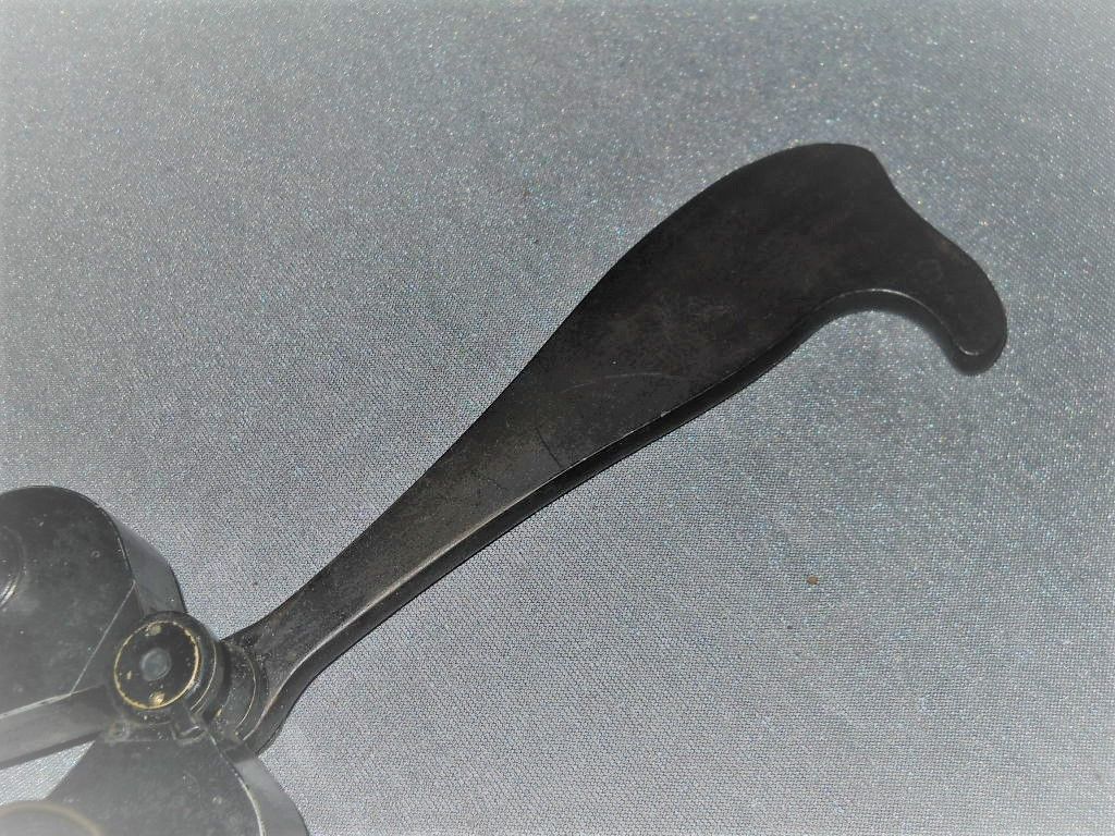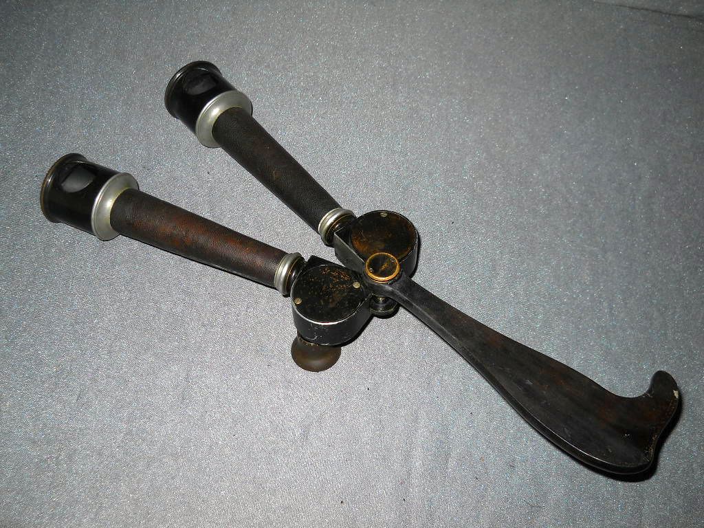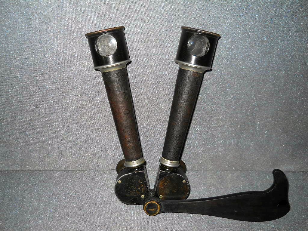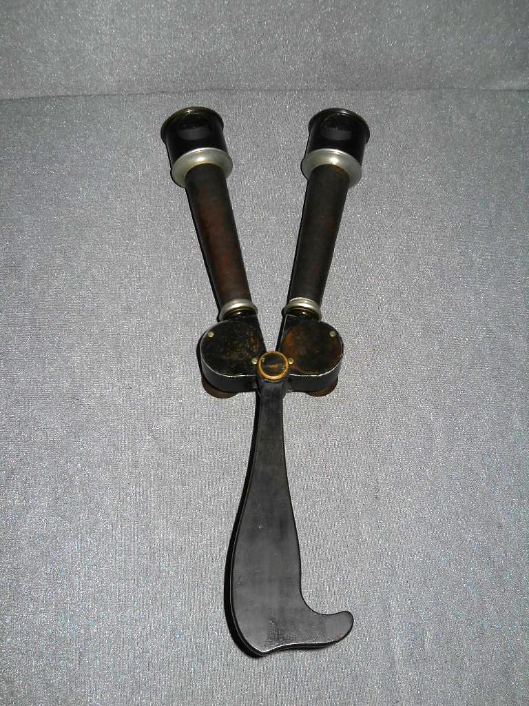 Objektiv Der geschwungene Haltegriff. Die Durchsicht durch das Relieffernrohr. Höhe mit Haltegriff = 40 cm, Breite mit augeklappten Armen